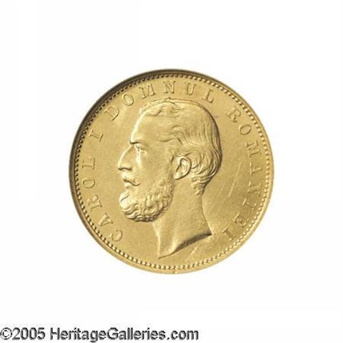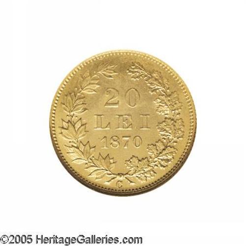 <B>Carol I gold 20 Lei 1870C, </B></I>KM7, MS63 NGC, a superb example with full mint brilliance and sharply defined details. Very rare type which is virtually never available in the market.