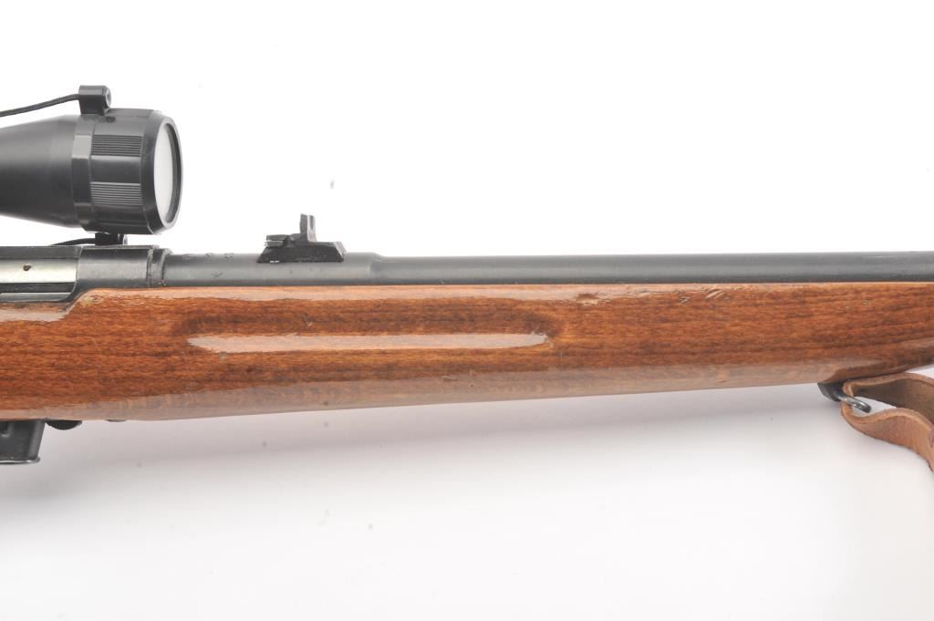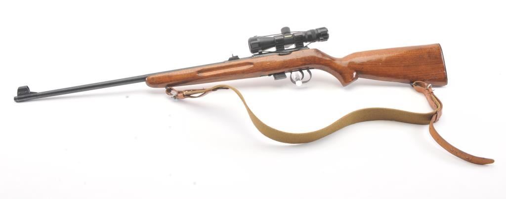 Romanian M-1969 training rifle, #D5540, .22 LR cal., 23 1/4" barrel, blued finish, open sights, smooth walnut stock with lanyard loops, canvas sling and Simmons .22 Mag 4x28 scope. Rifle is in near fine condition,retaining approximately 95% original finish, bright bore and crisp action. 3 mags included. (Modern/PPT) Est. $175-350