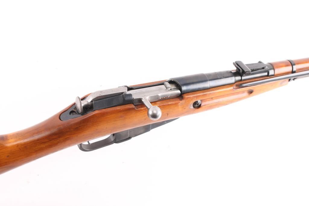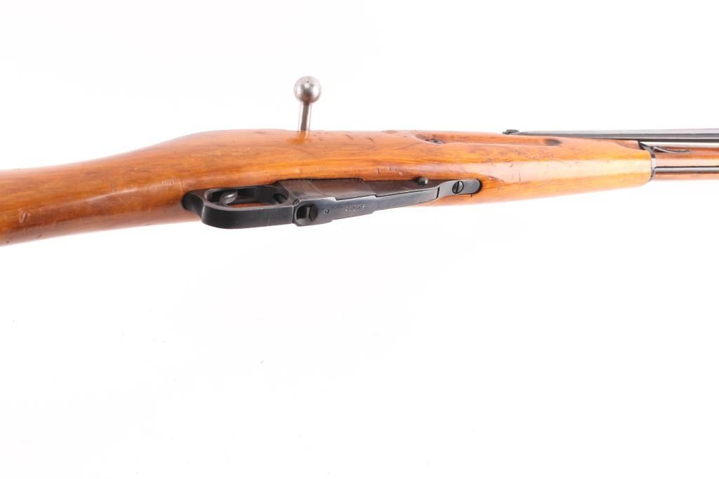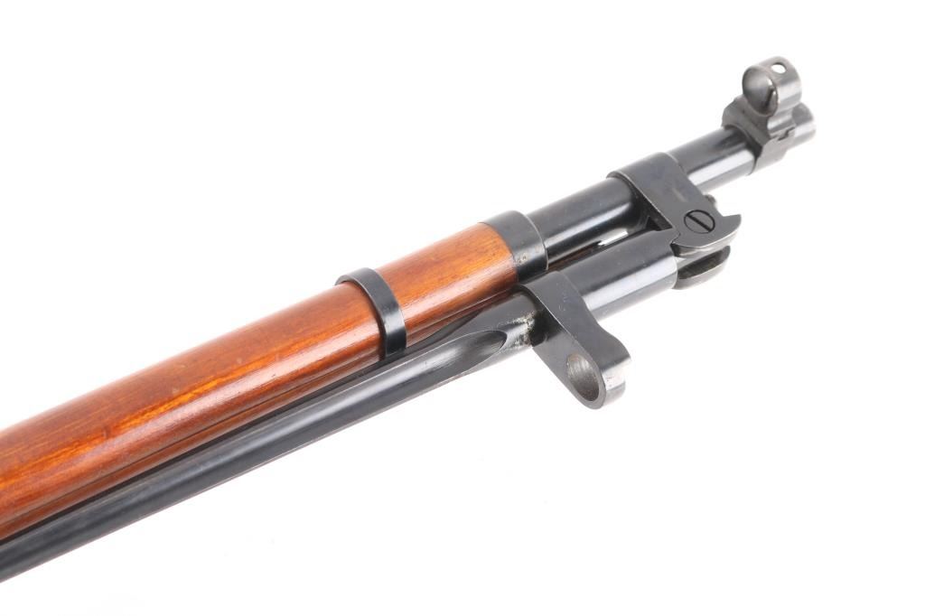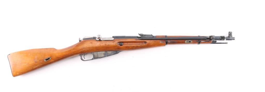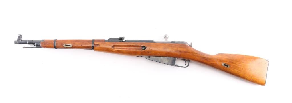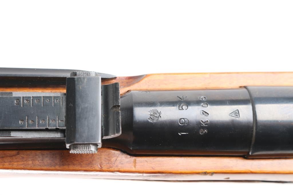 Romanian Military issue. This M44 carbine was manufactured by the Cugir arsenal in low numbers (Around 70,000) for a total of 3 yrs.(1953-55) Blued metal finish, with smooth hardwood stock, and handguard. Chrome bolt. 20 1/4" barrel, with hooded elevation adjustable front sight post, and adjustable rear sights. Magazine fed from a fixed 5-rd box magazine. Integrated side folding spike bayonet attached. Dated 1954. Manufacturer of an arrowhead in triangle on barrel. (Not to be confused with the Russian Izhevsk mark) Serial #'s match throughout. No import marks observed. Cleaning rod present. Bore appears excellent/bright.. Action is smooth/tight. Wood is good/sound , with the usual minor dings/dents on a military surplus rifle. Has the 'C' in diamond cartouche by the lower sling slot, indicating Romanian manufactured.