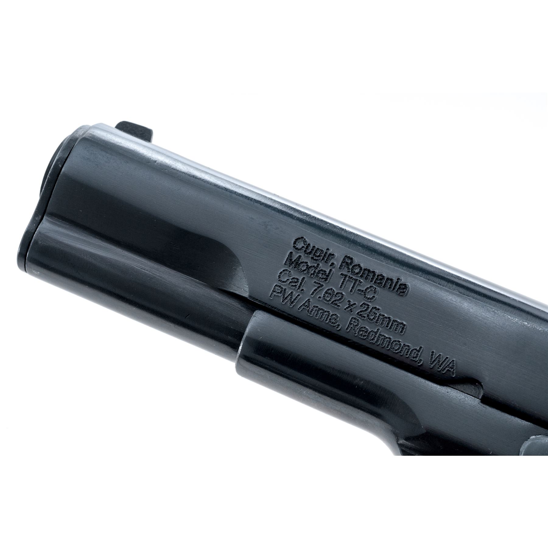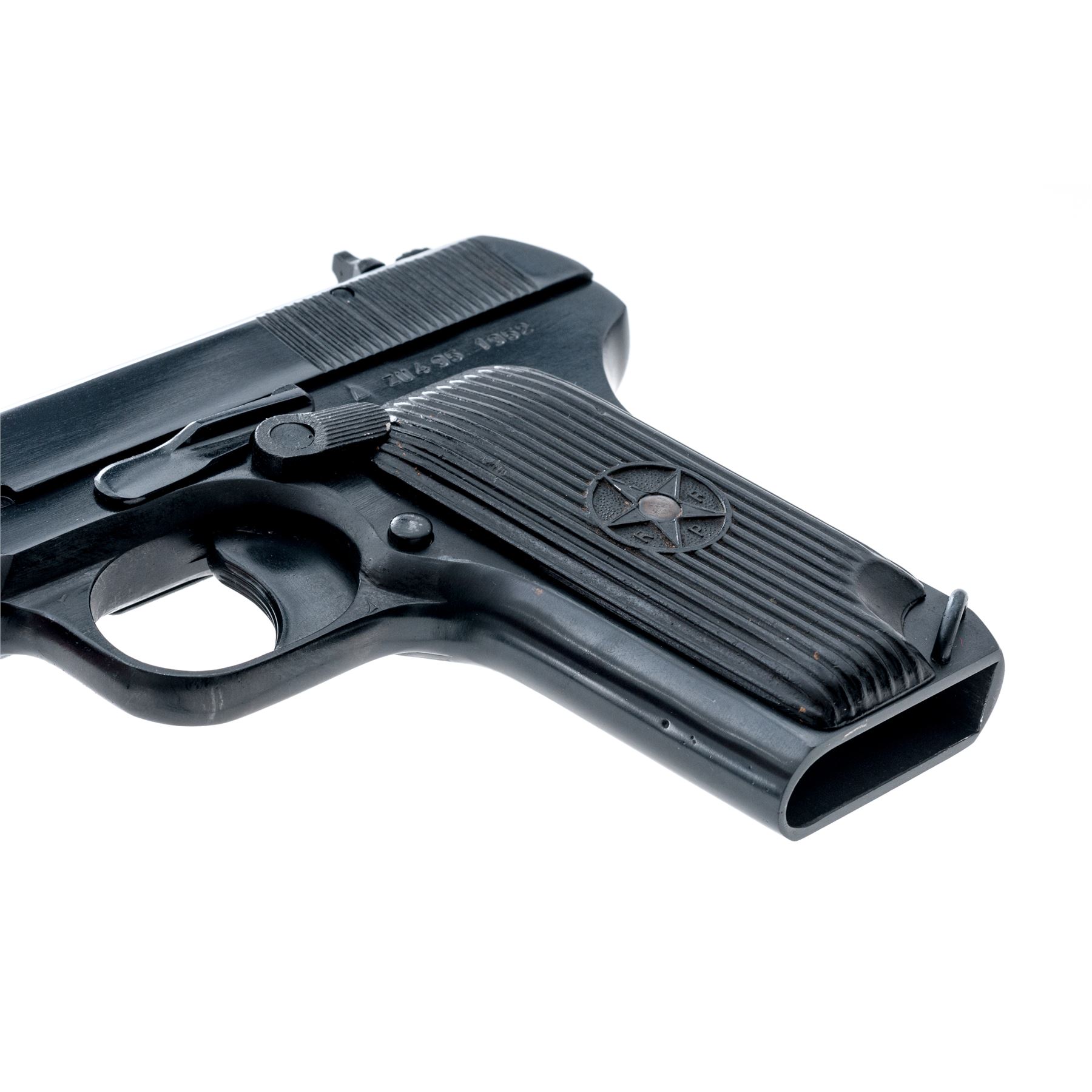 Romanian TT-33 Semi-Automatic Pistol, #ZU495, 7.62x25mm cal., 4.5'' barrel, blued finish, black plastic grips, fixed blade front sight and notched rear sight. Marked on left side of frame with Cugir arsenal stamp and ''1952''. Grips have five-pointed star containing ''RPR''. Includes two (2) non-matching numbered magazines in very good condition. Safety lever below slide stop. Condition overall is very good with approx. 98% of the reblued finish remaining on the metal. Grips are very good with most wear on the left side and several chips present. Action is smooth, bore is good with old light pitting present. Import stamps on left side of slide. Est.: $200-$350. (C&R/PPT)