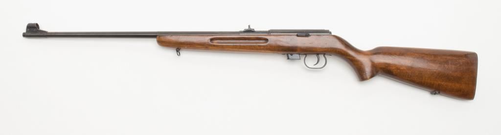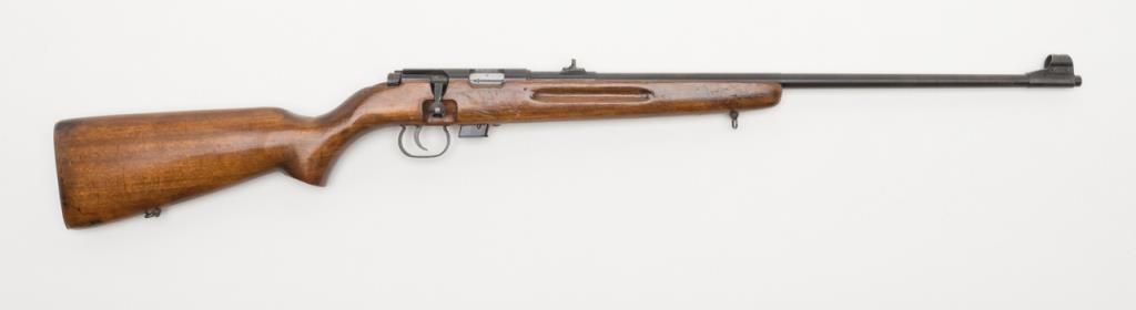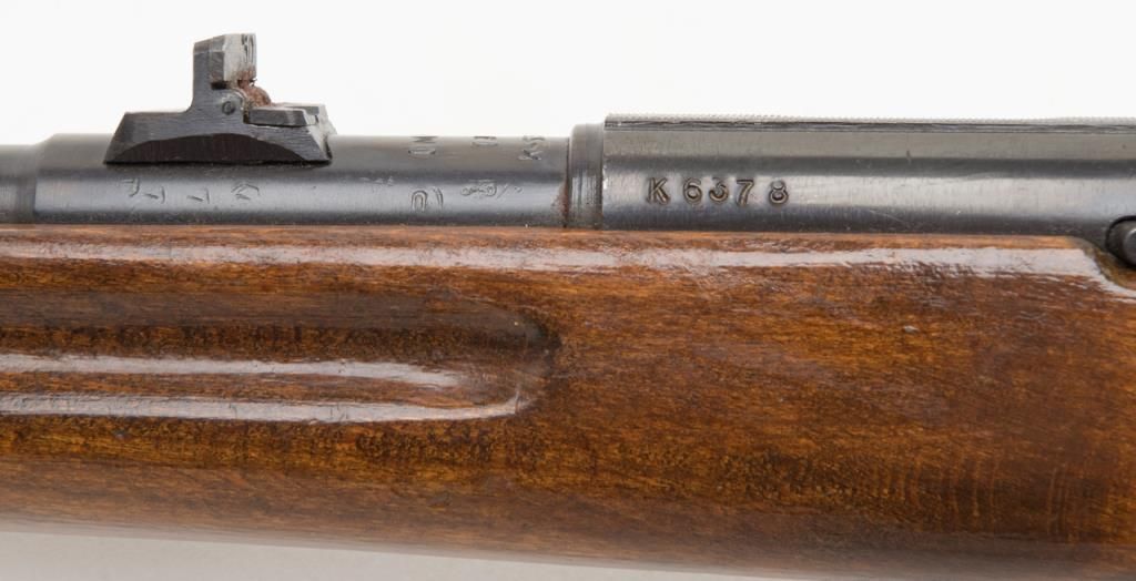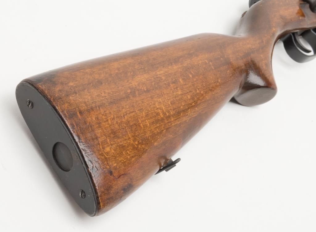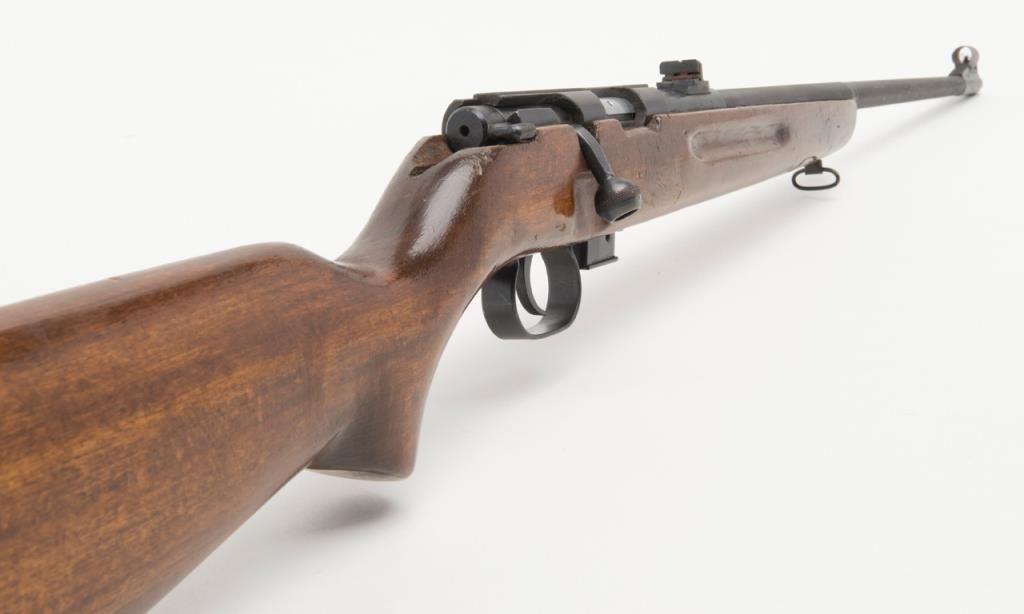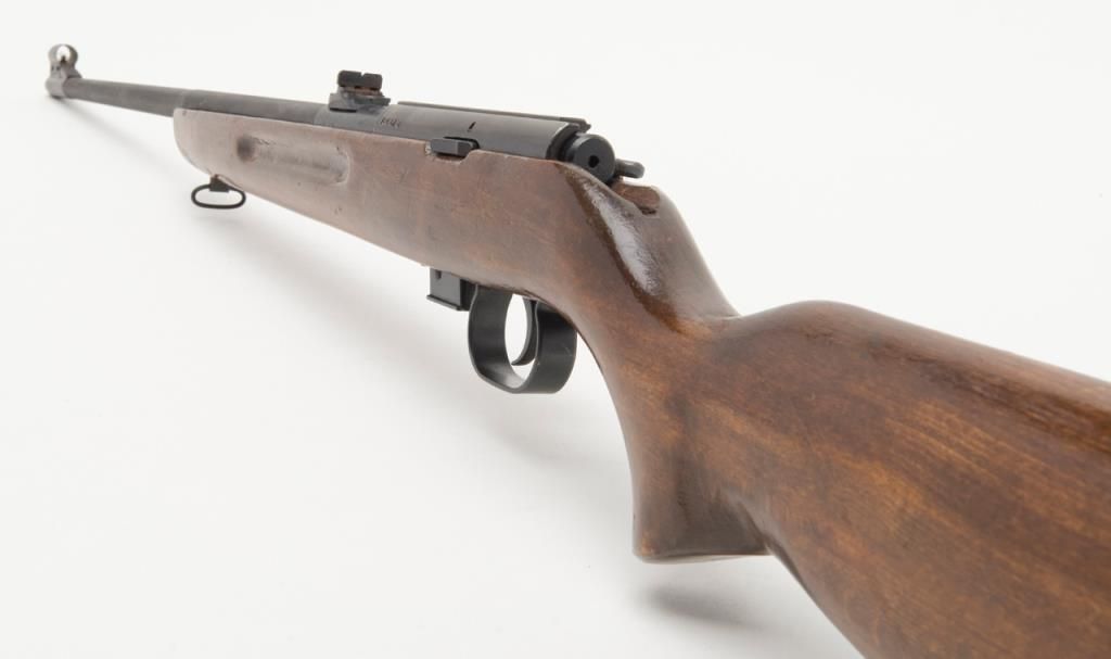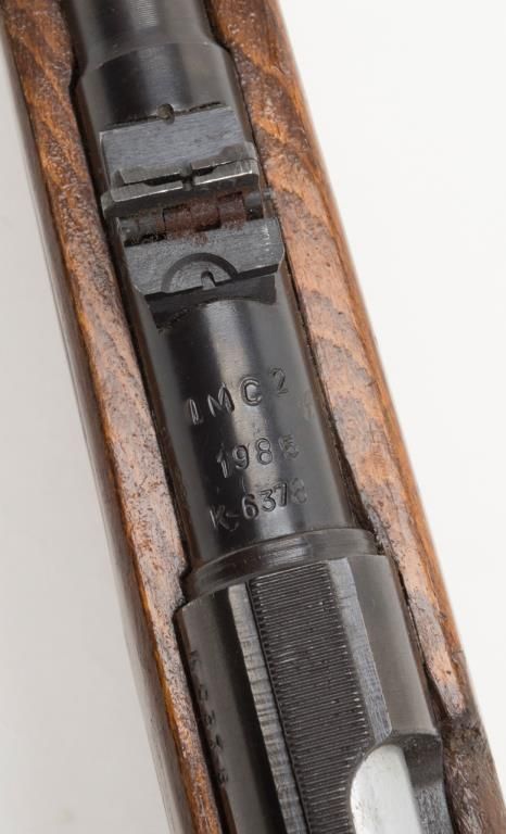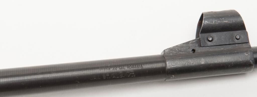 Romanian bolt action training rifle, .22 caliber, Serial #K6378. The rifle is in overall very good condition with a 23”, import marked barrel. The rifle retains nearly all of its blued finish with some light surface rust present on the barrel.The barrel is marked “1985” forward the front ring and features a hooded front and two-leaf folding rear sight. The smooth wood stock is in good condition with typical mars and compressions from use. The bore is very good, action crisp andmarkings sharp on this training rifle. The rifle includes on magazine. (modern/ PPT). Est.: $175-$350.