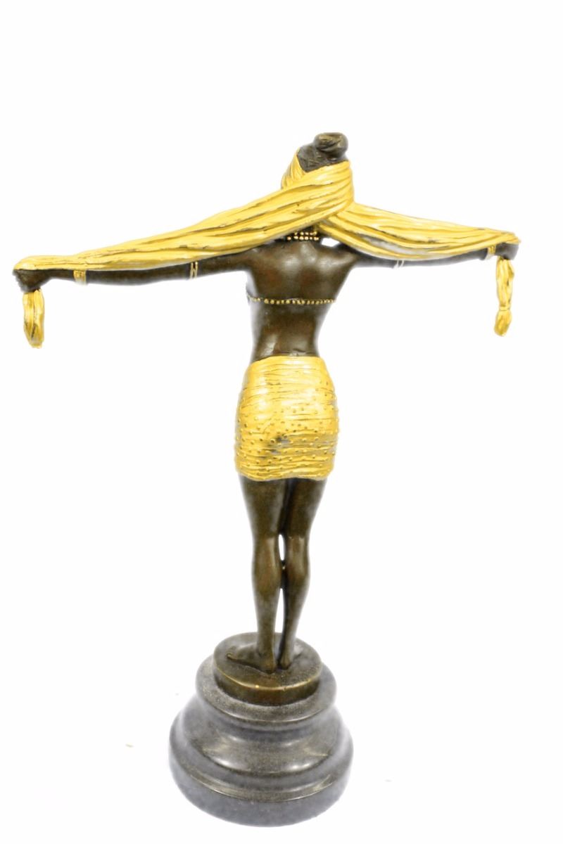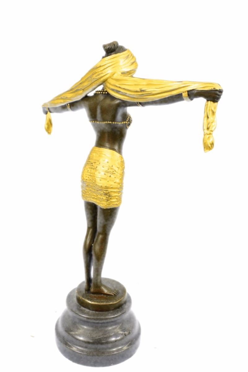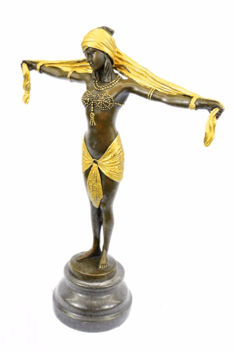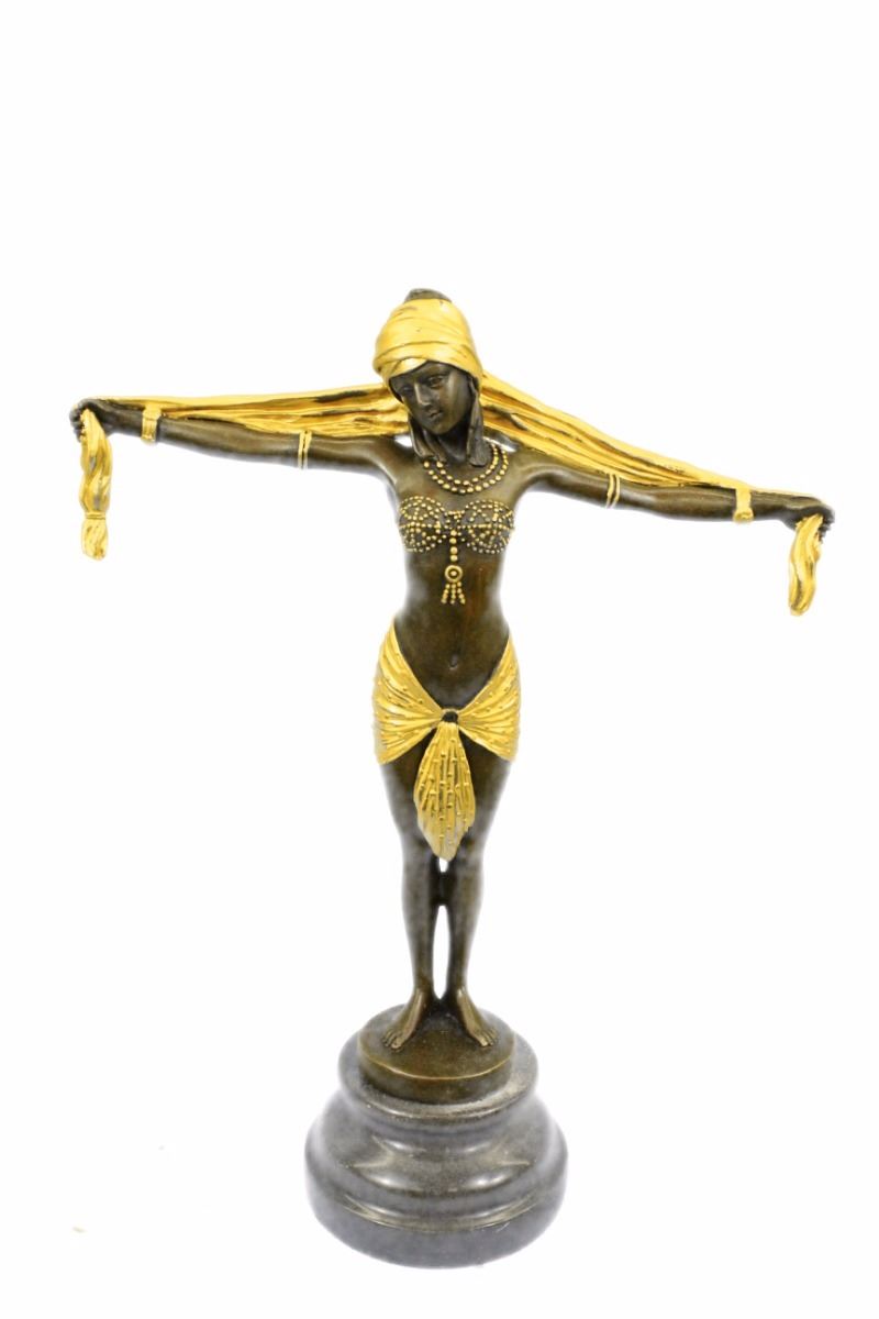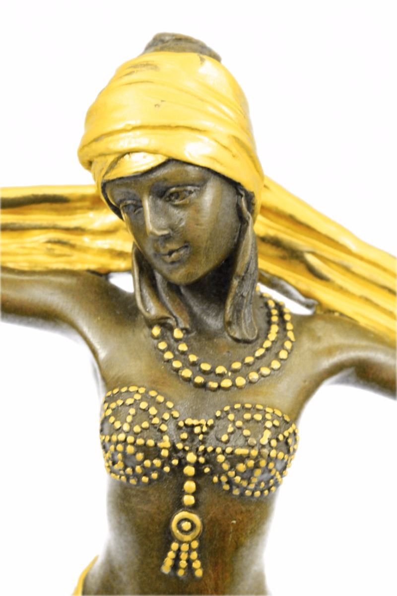 The Belly Dancer Takes The Floor And Strikes Her Opening Pose. She Wraps A Scarf Around Her Head And Holds The Long Ends Out To Her Side. She Tilts Her Head To The Side And Shuts Her Eyes, Waiting For The Beat To Begin. Her Arms Are Out Stretched Wide As She Holds On To Her Scarf Letting The Ends Dangle From Her Hands. This Gorgeous Gypsy Performs Her Classic Belly Dance, Letting Strangers Fall In Love With The Sight Of Her. Her Curvaceous Body Is Astounding And Her Outfit Shows It Off Beautifully. Her Beaded Top Holds Up Her Perky Breasts And A Sash Is Tightly Wrapped Around Her Curvy Hips. She Has Gorgeous Details From The Scarf That Wraps Around Her Head To The Tassel That Falls On To Her Stomach. 100% Bronze And Handmade, This Brown Patina Sculpture Was Cast Using The "Lost Wax Method" And Mounted On A Marble Base. Bronze Dimensions With Marble Base: Height 13 X Width 9 inches. Weight: 7 Lbs.