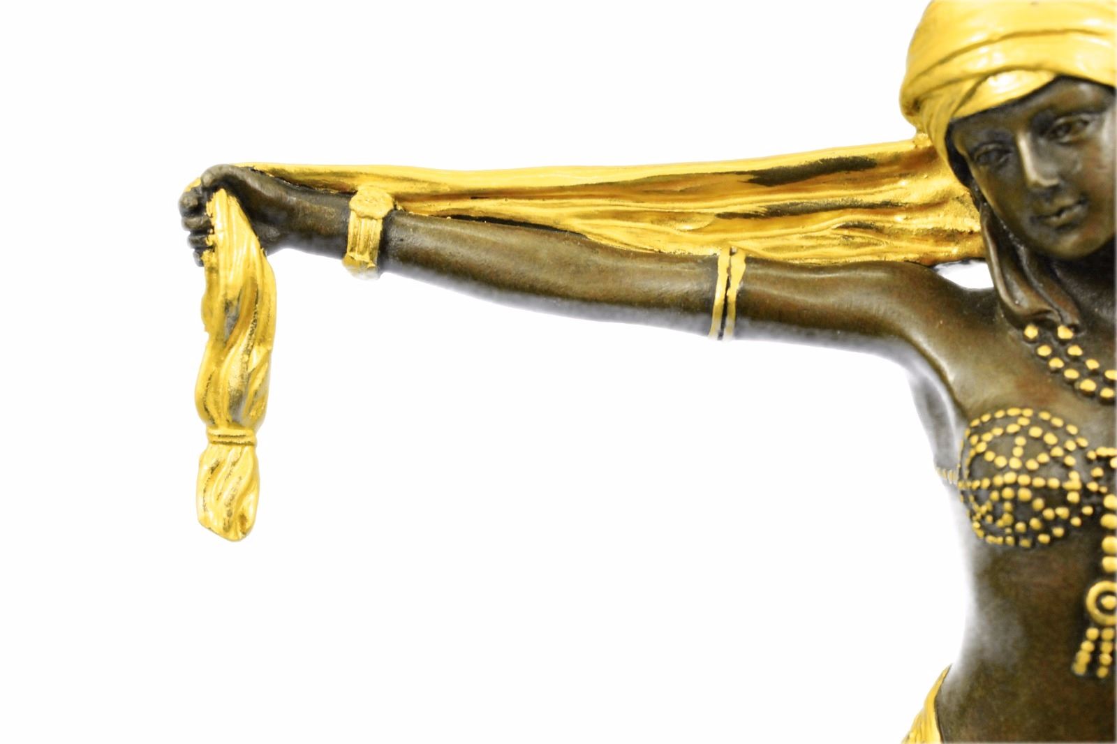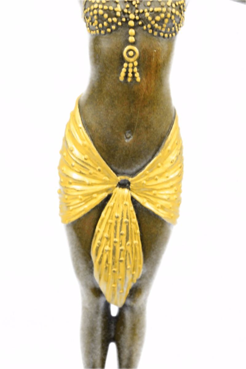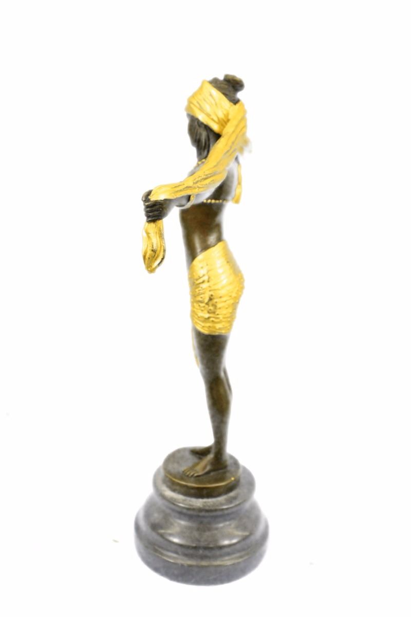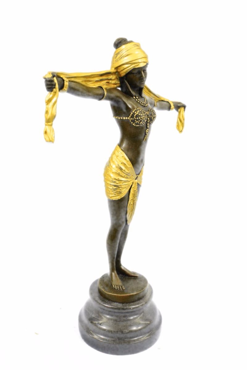 The Belly Dancer Takes The Floor And Strikes Her Opening Pose. She Wraps A Scarf Around Her Head And Holds The Long Ends Out To Her Side. She Tilts Her Head To The Side And Shuts Her Eyes, Waiting For The Beat To Begin. Her Arms Are Out Stretched Wide As She Holds On To Her Scarf Letting The Ends Dangle From Her Hands. This Gorgeous Gypsy Performs Her Classic Belly Dance, Letting Strangers Fall In Love With The Sight Of Her. Her Curvaceous Body Is Astounding And Her Outfit Shows It Off Beautifully. Her Beaded Top Holds Up Her Perky Breasts And A Sash Is Tightly Wrapped Around Her Curvy Hips. She Has Gorgeous Details From The Scarf That Wraps Around Her Head To The Tassel That Falls On To Her Stomach. 100% Bronze And Handmade, This Brown Patina Sculpture Was Cast Using The "Lost Wax Method" And Mounted On A Marble Base. Bronze Dimensions With Marble Base: Height 13 X Width 9 inches. Weight: 7 Lbs.