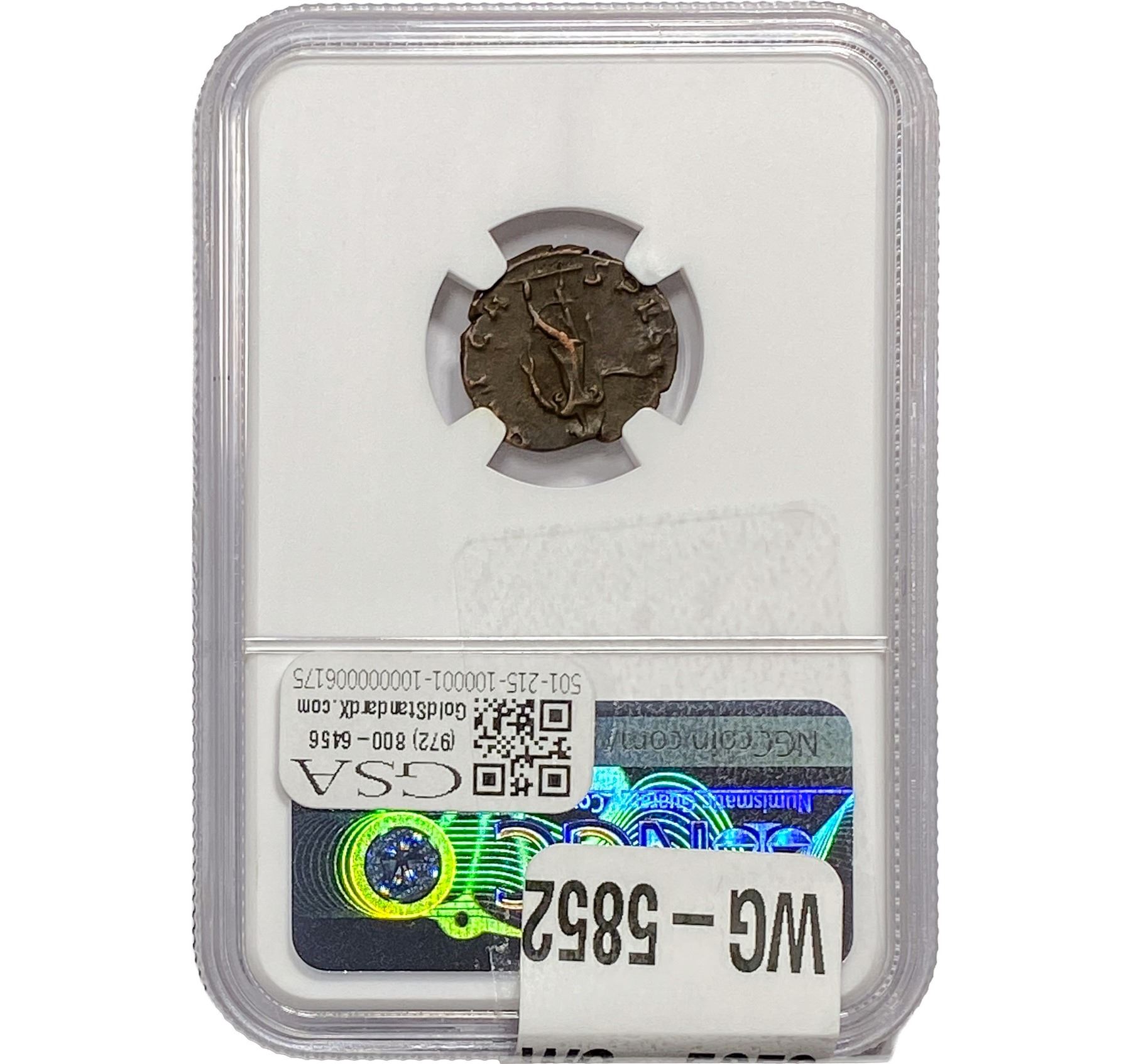 e. Coins sold referencing a third-party grading service are sold “AS IS” without any express or implied warranty, except for a guarantee by GSA that they are genuine. Removal or alteration of the holder, voids all of Bidder’s claims concerning that Product. Certain warranties may be available from the grading services and Bidders are referred to them for further details: Numismatic Guaranty Corporation (NGC), PO Box 4776, Sarasota, FL 34230, www.ngccoin.com/services/writtenguarantee.asp; Professional Coin Grading Services (PCGS), PO Box 9458, Newport Beach, CA 92658, www.pcgs.com/guarantee.html; ANACS, 6555 S. Kenton St., Ste. 303, Englewood, CO 80111; and Independent Coin Grading Co. (ICG), 7901 East Bellview, Ave., Suite 50, Englewood, CO 80111.