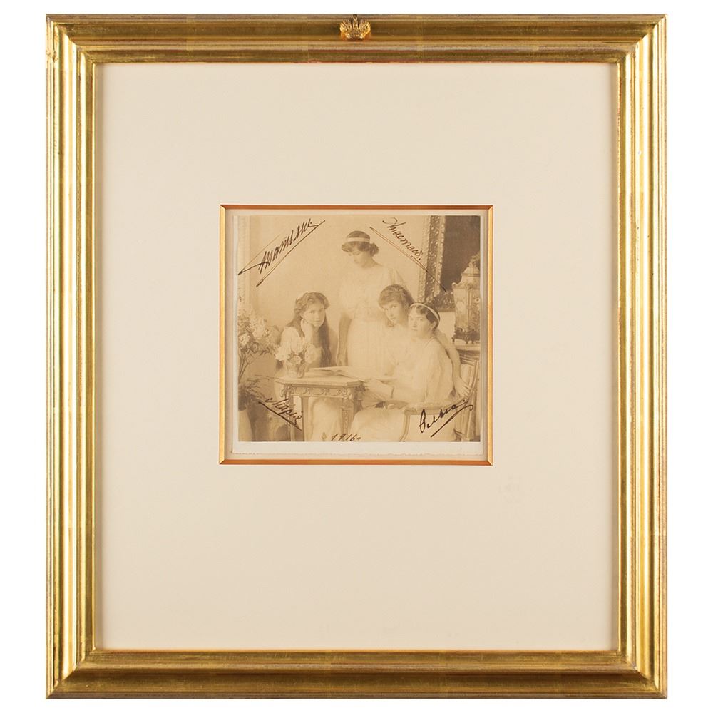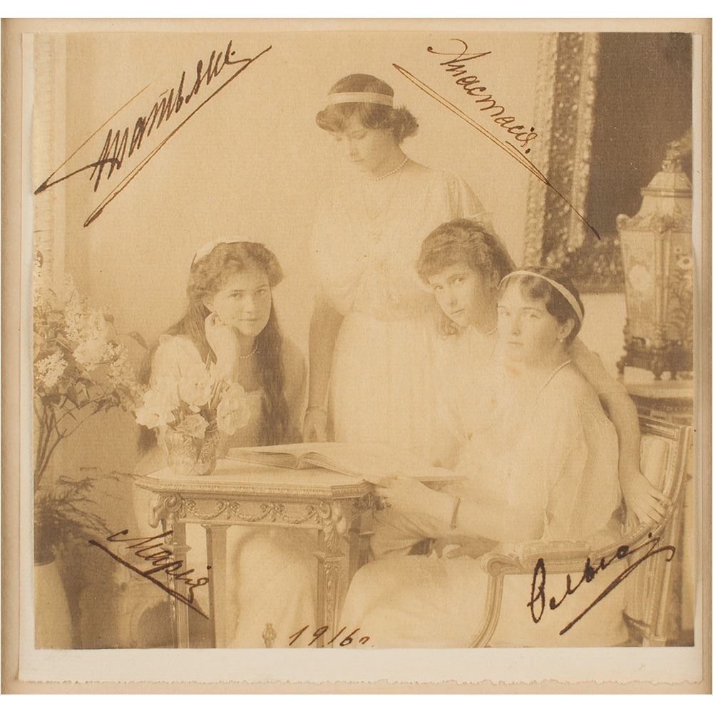 Olga, Tatiana, Maria, and Anastasia Romanova, the daughters of Emperor Nicholas II of Russia and his consort, Alexandra Feodorovna, were the most famous princesses of their day. Signed photographs are extremely rare, as they were all executed by Bolshevik revolutionaries at Yekaterinburg on 17 July 1918, aged 22, 21, 19, and 17, respectively. A magnificent signed photograph and a true rarity of Russian royalty.