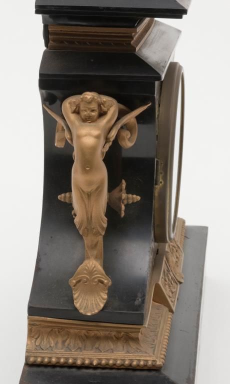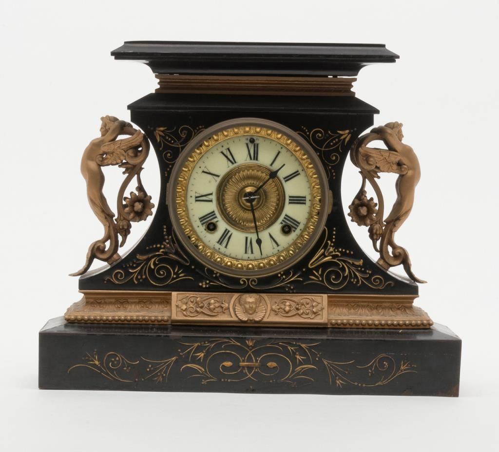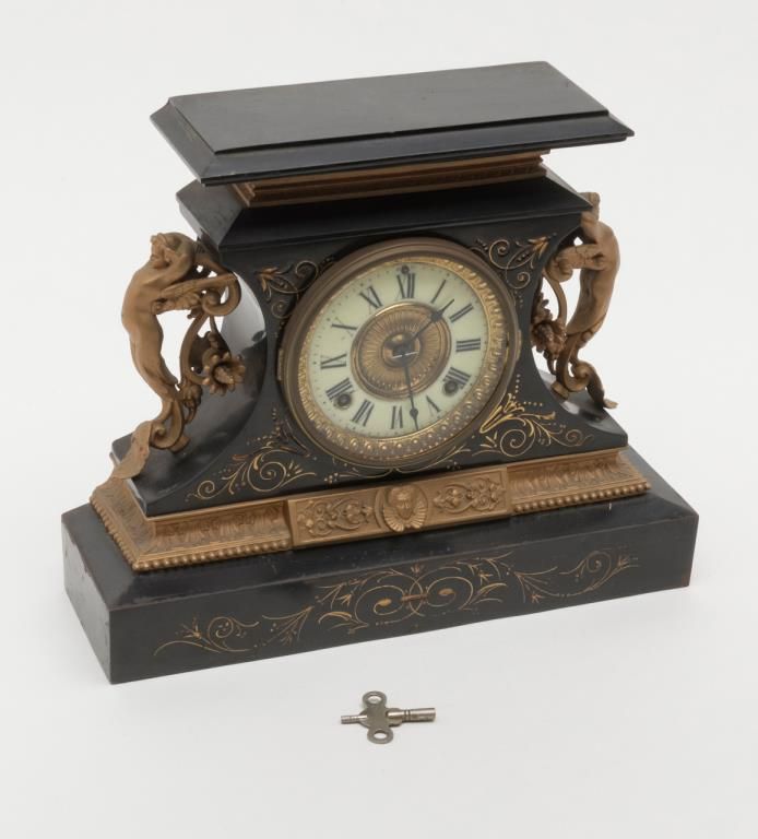 Romantic style mantle clock with fancy metal mounts and onyx base showing Angels at sides and double keyed for bells that ring on the quarter hour. The clock measures 12 ½” in height by 15” in width. The clock is marked Ansonia Clock Company, New York. A key and pendulum are included. The clock is working and ringing but we cannot guarantee accuracy. The exterior shows some small chips at the corners and edges and patina to the metal mounts. Circa about 1890 to 1920. Est.:$175-$350
