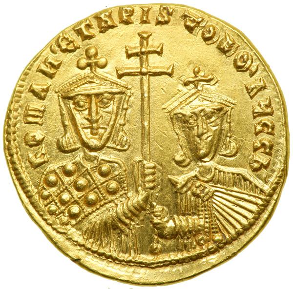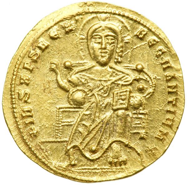 Romanus I and Christopher, 921-931. Gold Solidus (4.41 g) minted at Constantinople. Christ nimbate, seated facing on lyre-backed throne, holding book of Gospels. Reverse: Facing crowned busts of Romanus, bearded and wearing loros, on left, and Christopher, beardless and wearing chlamys, on right, holding patriarchal cross between them. D.O. 7; S. 1745. A little scratching (graffito "H"), especially in left obverse field; small mark at edge. Nearly Mint State.