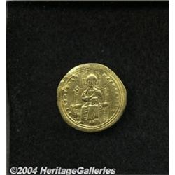 <B>Romanus III.</B></I> 1028-1034. AV histamenon nomisma (24 mm, 4.32 g). Constantinople. Christ enthroned facing, raising right hand in benediction and holding Gospels / Romanus standing facing on left, holding globus cruciger, being crowned by the Virgin standing facing on right. DOC 1d; SB 1819. Good VF. <BR><I>From the Geneva Collection.</B></I> <BR><BR><B>Important notice:</B> Heritage usually auctions material at the rate of 200-250 lots per hour. On some occasions eBay Live bid software or the Internet may not be able to keep up with the pace of the auction. We recommend placing a realistic absentee bid now as insurance to avoid disappointment. Occasionally the auctioneer may eliminate or reject an eBay Live bid, and the auctioneer may also reopen a lot after the close of the eBay live bidding (usually because we missed an audience bid), and may reject your bid even if it shows you as the winning bidder. By bidding via eBay Live, you agree that Heritage may award the lot to another bidder at its sole discretion under the circumstances described above or any other reasonable circumstances. Since eBay bids are not shown to us until we open the lot on the floor, we treat those bids just like floor bids. In most cases the floor responds before the eBay bid is presented to us, due to Internet lag time, so for consistency we have made it a policy that floor bids are always considered first over tie eBay live bids. Also please note that all Heritage lots purchased through eBay Live carry a 20% Buyer's Premium. Please make sure you read the Terms and Conditions before you bid.