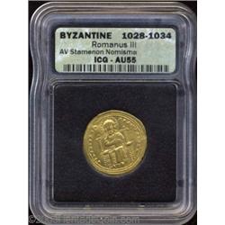 <TABLE cellSpacing=0 cellPadding=0 width="100%" bgColor=#000000 border=0><TBODY> <TR><TD width="100%"><TABLE cellSpacing=1 cellPadding=3 width="100%" border=0><TBODY><TR><TD width="100%" bgColor=#79735c><FONT face=arial color=#ffffff size=3><B>Description</B> </FONT></TD></TR><TR><TD width="100%" bgColor=#ffffff><FONT face=arial size=2><B>Romanus III.</B></I> A.D. 1028-1034. AV histamenon nomisma (24 mm). Christ enthroned facing, raising right hand in benediction, holding Gospels in left / Romanus standing facing on left, holding globus cruciger in left hand, being crowned by the Virgin standing facing on right. DOC 1b; SB 1819. AU55 ICG. </FONT></TD></TR></TBODY></TABLE></TD></TR></TBODY></TABLE><BR><A name=PricesRealized></A><TABLE cellSpacing=0 cellPadding=0 width="100%" bgColor=#000000 border=0><TBODY><TR><TD width="100%"><TABLE cellSpacing=1 cellPadding=3 width="100%" border=0><TBODY><TR><TD width="100%" bgColor=#79735c><A name=PR><FONT face=arial color=#ffffff size=3><B>Previous Prices from Heritage Auctions</B> </FONT></A></TD></TR><TR><TD bgColor=#f6f6ed>No Prior Data Recorded </TD></TR><TR><TD bgColor=#ffffff><FONT face=arial size=1 ?>PLEASE NOTE: All prices realized reflect the final hammer price PLUS the buyer's premium in auctions that charge a buyer's premium. Each item has a notation at the top of the listing indicating whether that lot included a buyer's premium. Example: A item that sells with a final hammer price of $100 and a 20% buyer's premium will display with a price realized of $120. All information listed is intended to be as accurate as possible, but errors are possible. Please use this guide carefully and inform us of any inaccuracies. </FONT></TD></TR></TBODY></TABLE></TD></TR></TBODY></TABLE><BR><TABLE cellSpacing=0 cellPadding=0 width="100%" bgColor=#000000 border=0><TBODY><TR><TD width="100%"><TABLE cellSpacing=1 cellPadding=3 width="100%" border=0><TBODY><TR><TD width="100%" bgColor=#79735c colSpan=6><FONT face=arial color=#ffffff size=3><B>Price Guide*</B> </FONT></TD></TR><TR bgColor=#f6f6ed><TD align=middle><B>Grade</B> </TD><TD align=middle><B>Coin World<BR>(Trends)</B> </TD><TD align=middle><B>Numismedia<BR>Retail</B> </TD><TD align=middle><B>Numismedia<BR>Wholesale</B> </TD><TD align=middle><B>Coin<BR>Universe</B> </TD><TD align=middle><B>Heritage<BR>Value Index</B> </TD></TR><TR bgColor=#ffffff><TD colSpan=6><FONT size=1>*All information listed is intended to be as accurate as possible, but errors are possible. No item may be returned or refused based on this information which is provided as a service to our customers. You should contact each pricing source directly to determine the accuracy of this information. </FONT></TD></TR></TBODY></TABLE></TD></TR></TBODY></TABLE><BR><TABLE cellSpacing=0 cellPadding=0 width="100%" bgColor=#000000 border=0><TBODY><TR><TD width="100%"><TABLE cellSpacing=1 cellPadding=3 width="100%" border=0><TBODY><TR><TD width="100%" bgColor=#79735c><FONT face=arial color=#ffffff size=3><B>Population Guide</B> </FONT></TD></TR><TR bgColor=#ffffff> Important notice: Heritage usually auctions material at the rate of 200-250 lots per hour. On some occasions eBay Live bid software or the Internet may not be able to keep up with the pace of the auction. We recommend placing a realistic absentee bid now as insurance to avoid disappointment. Occasionally the auctioneer may eliminate or reject an eBay Live bid, and the auctioneer may also reopen a lot after the close of the eBay live bidding (usually because we missed an audience bid), and may reject your bid even if it shows you as the winning bidder. By bidding via eBay Live, you agree that Heritage may award the lot to another bidder at its sole discretion under the circumstances described above or any other reasonable circumstances. Also please note that all Heritage lots purchased through eBay Live carry a 20% Buyer's Premium. Please make sure you read the Terms and Conditions before you bid.</TD></TR></TBODY></TABLE></TD></TR></TBODY></TABLE>