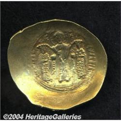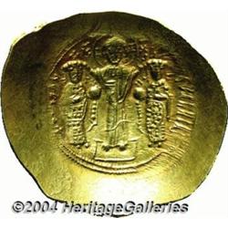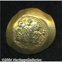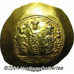 <B>Romanus IV.</B></I> 1068-1071. AV histamenon (29 mm, 4.40 g). Constantinople. Michael, Constantius and Andronicus standing facing; dotted exergual band below / Christ standing facing on footstool, crowning Romanus and Eudocia. DOC 2; SB 1861. Good VF. <BR><I>From the Geneva Collection.</B></I> <BR><BR><B>Important notice:</B> Heritage usually auctions material at the rate of 200-250 lots per hour. On some occasions eBay Live bid software or the Internet may not be able to keep up with the pace of the auction. We recommend placing a realistic absentee bid now as insurance to avoid disappointment. Occasionally the auctioneer may eliminate or reject an eBay Live bid, and the auctioneer may also reopen a lot after the close of the eBay live bidding (usually because we missed an audience bid), and may reject your bid even if it shows you as the winning bidder. By bidding via eBay Live, you agree that Heritage may award the lot to another bidder at its sole discretion under the circumstances described above or any other reasonable circumstances. Since eBay bids are not shown to us until we open the lot on the floor, we treat those bids just like floor bids. In most cases the floor responds before the eBay bid is presented to us, due to Internet lag time, so for consistency we have made it a policy that floor bids are always considered first over tie eBay live bids. Also please note that all Heritage lots purchased through eBay Live carry a 20% Buyer's Premium. Please make sure you read the Terms and Conditions before you bid.