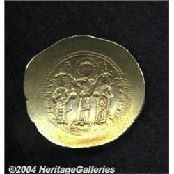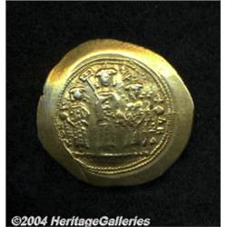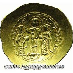 <B>Romanus IV.</B></I> 1068-1071. AV histamenon (28 mm, 4.36 g). Constantinople. Michael, Constantius and Andronicus standing facing; dotted exergual band below / Christ standing facing on footstool, crowning Romanus and Eudocia. DOC 2; SB 1861. Good VF. <BR><I>From the Geneva Collection.</B></I> <BR><BR><B>Important notice:</B> Heritage usually auctions material at the rate of 200-250 lots per hour. On some occasions eBay Live bid software or the Internet may not be able to keep up with the pace of the auction. We recommend placing a realistic absentee bid now as insurance to avoid disappointment. Occasionally the auctioneer may eliminate or reject an eBay Live bid, and the auctioneer may also reopen a lot after the close of the eBay live bidding (usually because we missed an audience bid), and may reject your bid even if it shows you as the winning bidder. By bidding via eBay Live, you agree that Heritage may award the lot to another bidder at its sole discretion under the circumstances described above or any other reasonable circumstances. Since eBay bids are not shown to us until we open the lot on the floor, we treat those bids just like floor bids. In most cases the floor responds before the eBay bid is presented to us, due to Internet lag time, so for consistency we have made it a policy that floor bids are always considered first over tie eBay live bids. Also please note that all Heritage lots purchased through eBay Live carry a 20% Buyer's Premium. Please make sure you read the Terms and Conditions before you bid.