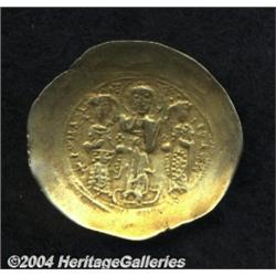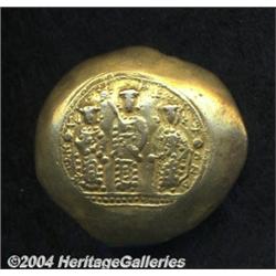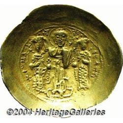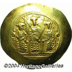 <B>Romanus IV.</B></I> 1068-1071. AV histamenon (27 mm, 4.05 g). Constantinople. Michael, Constantius and Andronicus standing facing; dotted exergual band below / Christ standing facing on footstool, crowning Romanus and Eudocia. DOC 2; SB 1861. VF. <BR><I>From the Geneva Collection.</B></I> <BR><BR><B>Important notice:</B> Heritage usually auctions material at the rate of 200-250 lots per hour. On some occasions eBay Live bid software or the Internet may not be able to keep up with the pace of the auction. We recommend placing a realistic absentee bid now as insurance to avoid disappointment. Occasionally the auctioneer may eliminate or reject an eBay Live bid, and the auctioneer may also reopen a lot after the close of the eBay live bidding (usually because we missed an audience bid), and may reject your bid even if it shows you as the winning bidder. By bidding via eBay Live, you agree that Heritage may award the lot to another bidder at its sole discretion under the circumstances described above or any other reasonable circumstances. Since eBay bids are not shown to us until we open the lot on the floor, we treat those bids just like floor bids. In most cases the floor responds before the eBay bid is presented to us, due to Internet lag time, so for consistency we have made it a policy that floor bids are always considered first over tie eBay live bids. Also please note that all Heritage lots purchased through eBay Live carry a 20% Buyer's Premium. Please make sure you read the Terms and Conditions before you bid.