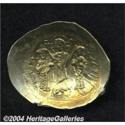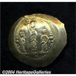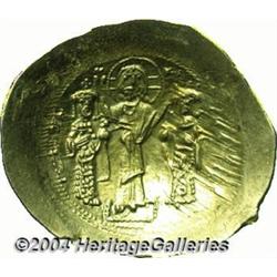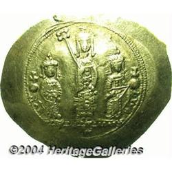 <B>Romanus IV.</B></I> 1068-1071. AV histamenon (28 mm, 4.39 g). Constantinople. Michael, Constantius and Andronicus standing facing; dotted exergual band below, N in exergue / Christ standing facing on footstool, crowning Romanus and Eudocia. DOC 2 var. (no N); SB 1861 var. (same). Good VF. It is unclear whether the mark in the exergue is the letter N or some sort of die break, although it appears to be the former. If so, it is probably a unique variety in the Byzantine series.<BR><I>From the Geneva Collection.</B></I> <BR><BR><B>Important notice:</B> Heritage usually auctions material at the rate of 200-250 lots per hour. On some occasions eBay Live bid software or the Internet may not be able to keep up with the pace of the auction. We recommend placing a realistic absentee bid now as insurance to avoid disappointment. Occasionally the auctioneer may eliminate or reject an eBay Live bid, and the auctioneer may also reopen a lot after the close of the eBay live bidding (usually because we missed an audience bid), and may reject your bid even if it shows you as the winning bidder. By bidding via eBay Live, you agree that Heritage may award the lot to another bidder at its sole discretion under the circumstances described above or any other reasonable circumstances. Since eBay bids are not shown to us until we open the lot on the floor, we treat those bids just like floor bids. In most cases the floor responds before the eBay bid is presented to us, due to Internet lag time, so for consistency we have made it a policy that floor bids are always considered first over tie eBay live bids. Also please note that all Heritage lots purchased through eBay Live carry a 20% Buyer's Premium. Please make sure you read the Terms and Conditions before you bid.