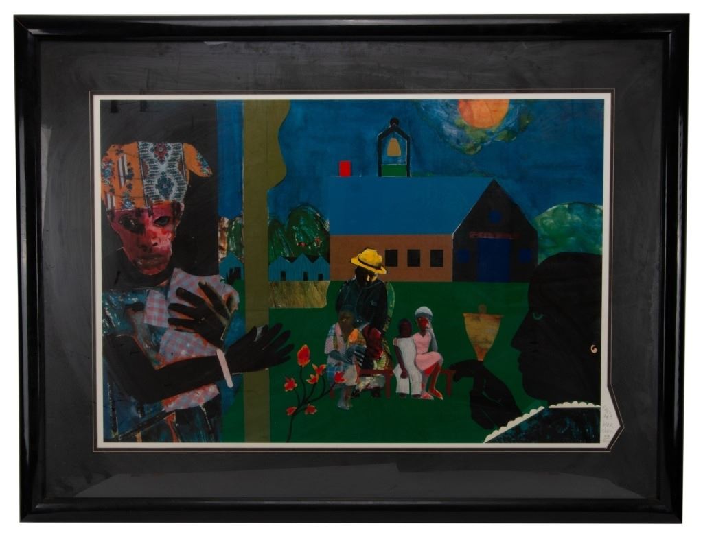 Item/Description: Pencil signed and numbered mixed media collage serigraph depicting figures in a school-house landscape. Signed in pencil by the estate and numbered 514/950. Printed posthumously from a collage executed in 1978, by the estate of the artist.