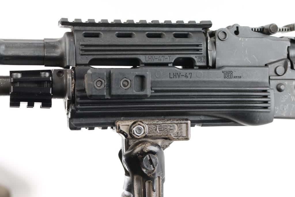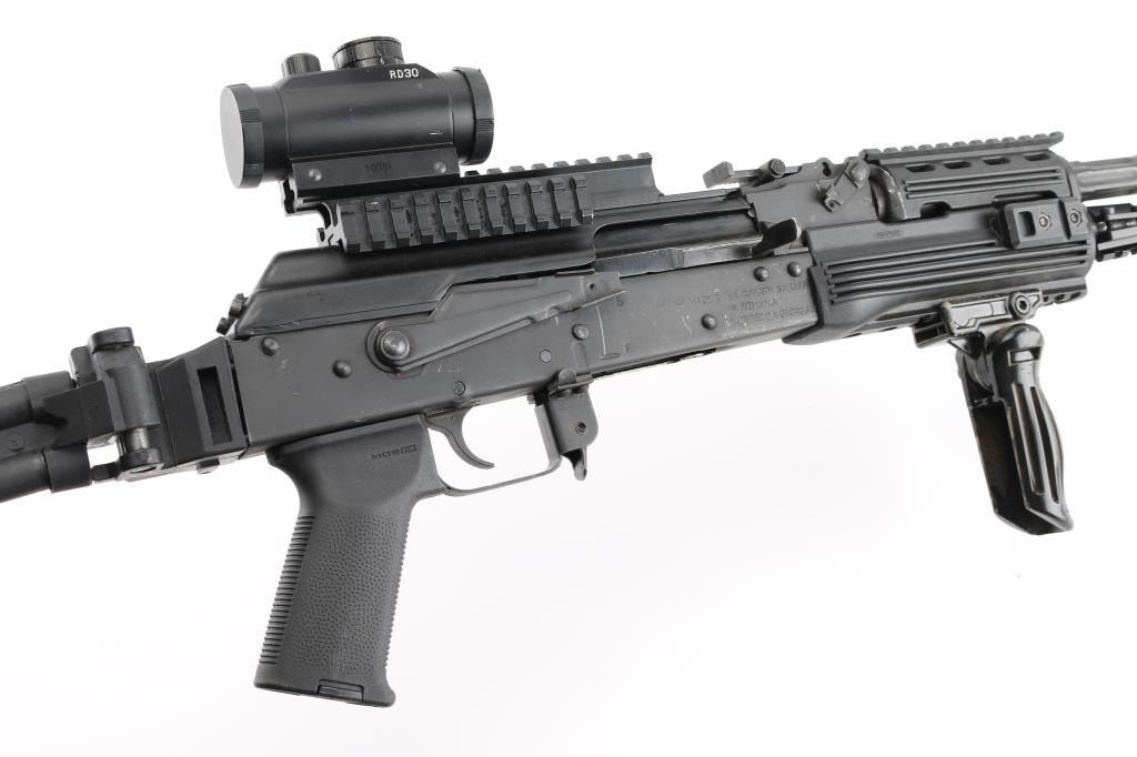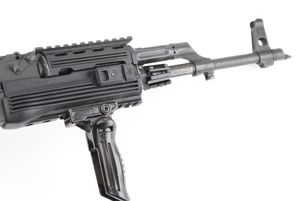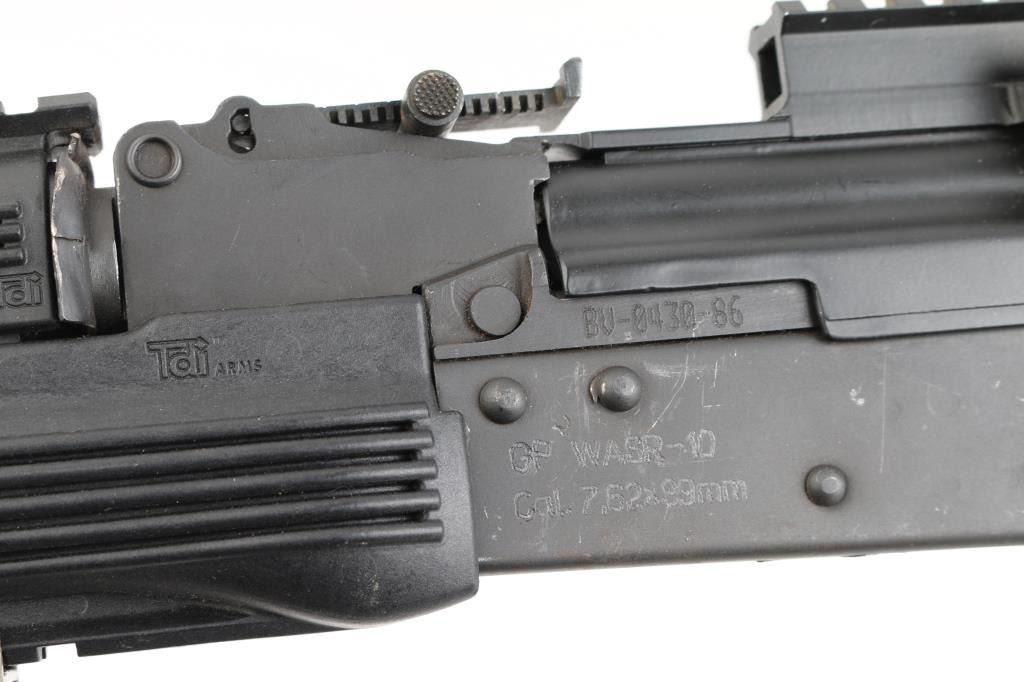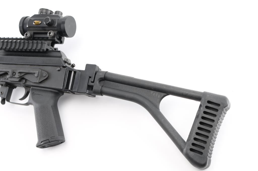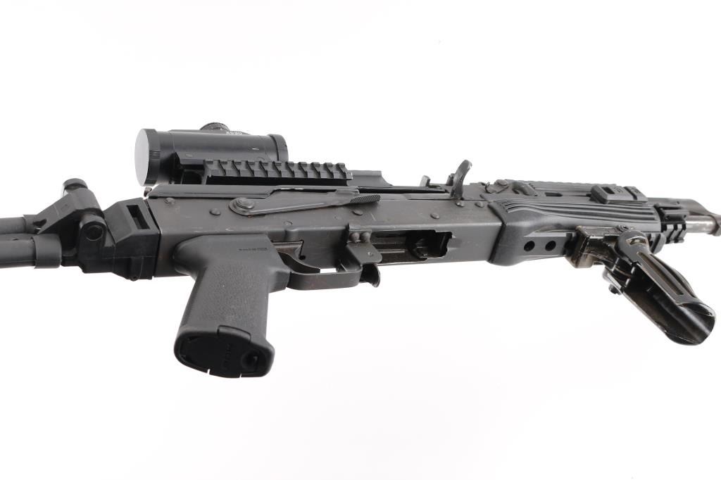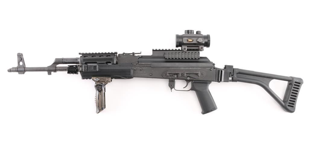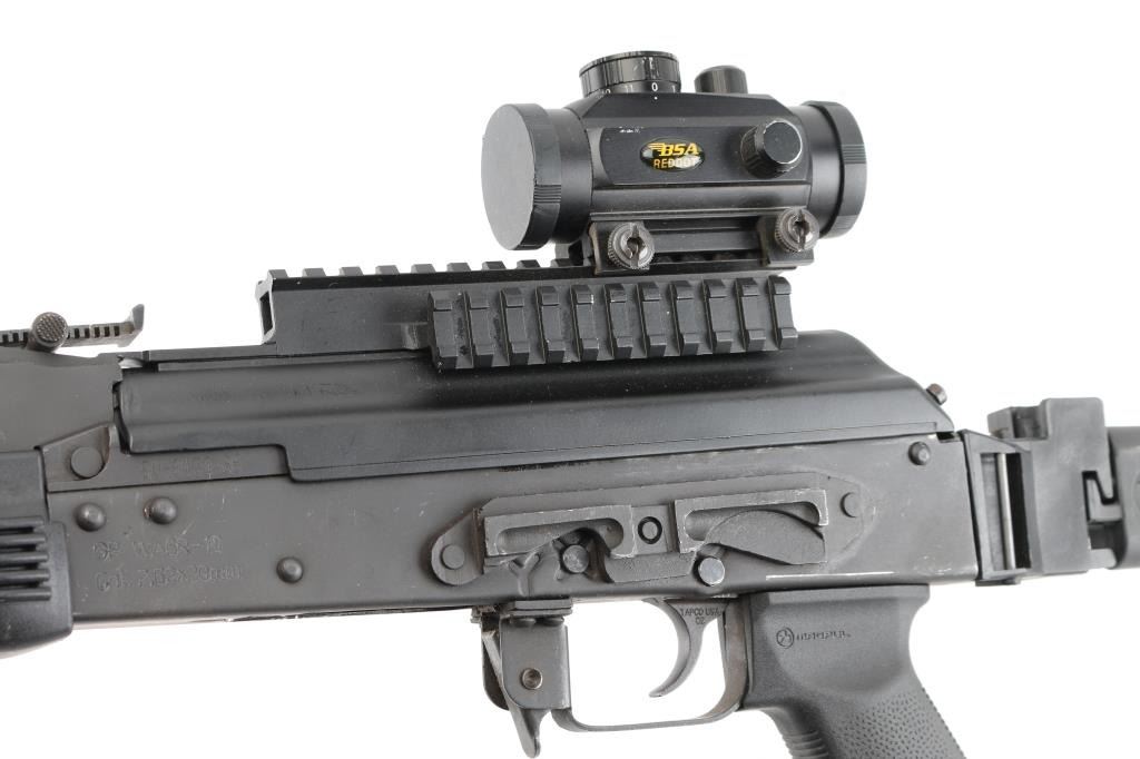 AK-47 style semi-automatic rifle chambered in 7.62 X 39mm made in Romania, imported by CAI. 16.25" chrome lined barrel with protected front sight post and adjustable U-notched rear sight, stamped steel receiver with tri-Picatinny rail on top, manual safety and Tapco smooth trigger, magazine release lever, TAI Arms black polymer ventilated forearm with Picatinny rails at 3, 12, 9 & 6 o'clock positions, Magpul textured pistol grip and Tapco polymer folding stock, slant muzzle brake. Bore is excellent bright. Action is crisp/tight. Comes with no cleaning rod, no magazine, has a mounted BSA red dot with covers, 5 position polymer front grip. NRA Condition is excellent. Modern Firearm.
