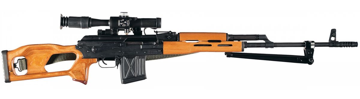 Elevation adjustable front and rear sights. Muzzle brake with bayonet lug removed. Has a clamp on bipod, green nylon sling and a Russian 4x24 illuminated scope.