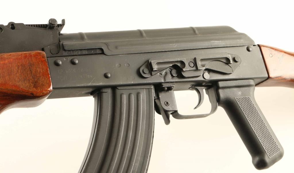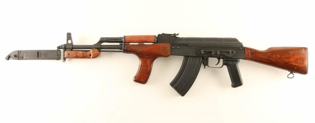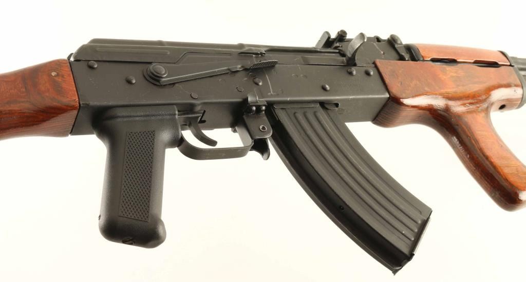 Romanian made AK platform semi-automatic modern sporting rifle chambered in 7.62x39mm. Imported by C.A.I. of Georgia, V.T. with import marks on the right side of the receiver. Features a matte black finish, 16.25" threaded barrel, slant muzzle break, bayonet lug on the gas block, shrouded adjustable post front sight, tangent rear sight graduated to 1,000 meters, stamped receiver with side mounted scope rail, cleaning rod, manual safety, smooth trigger, 20 round steel magazine, plain wood handguard, laminated wood forward grip forend, textured black synthetic pistol grip and laminated wood shoulder stock with sling swivel & trapdoor metal buttplate. Includes a bayonet with metal sheath. Rifle retains approximately 93% of it's original black finish showing scattered scuffs and light light scratches. Action is smooth, the bore is bright, and the wood stocks are very good. Condition is NRA Very Good. ***Modern Firearm***