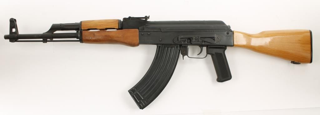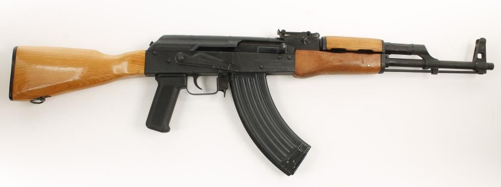 Romanian semi auto AK rifle with 16" barrel. Black finish, straight grip wood stock and forearm with upper handguard, black plastic checkered pistol grip, shrouded front sight, rear sight graduated to 1,000 meters and sling swivels. Excellent bore and action. Includes box and 1 high cap magazine. Condition: Very good showing very light use.