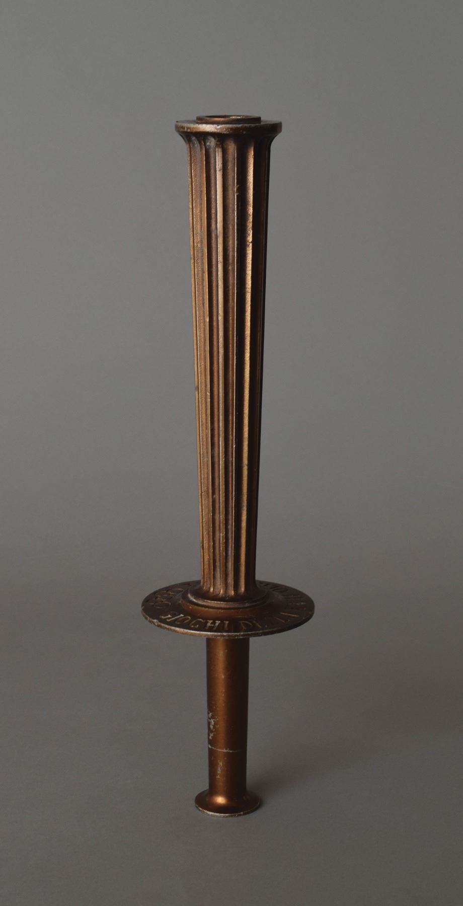 Official 1960 Rome Summer Olympics torch, constructed of bronzed aluminum, measuring 15.5? in length and 3.75? at its widest point, manufactured by the Curtisa firm of Bologna. The torch’s designer, Amedeo Maiuri, was a renowned Italian archaeologist famous for his studies of the Roman site of Pompeii. Inspired by the designs and patterns of the host city’s ancient ruins and monuments, the torch is grooved with slender conical fluting along its candlestick frame, features consistent with the classical touch of the 1960 Games. The torch platform bears the engraving, “Giochi della XVII Olympiade,” and maker’s marks, “M. F.—Curtisa—Bologna, 2052,” can be found inscribed on the bottom of the handle. The handle and body exhibit scattered wear and scratches. The Olympic flame was lit on August 12 in Olympia, Greece, and was carried a total of 1,863 km—excluding the flame’s voyage from Athens to Syracuse aboard the training ship Amerigo Vespucci—by over 1,500 torchbearers during its historic fourteen day relay. The XVII Olympiad earns the distinction of being the first Summer Olympics to be telecast in North America.