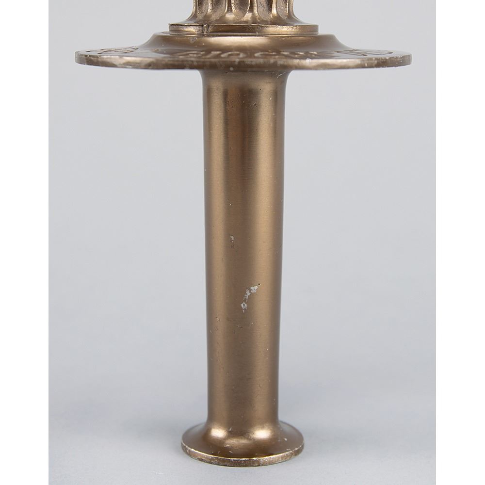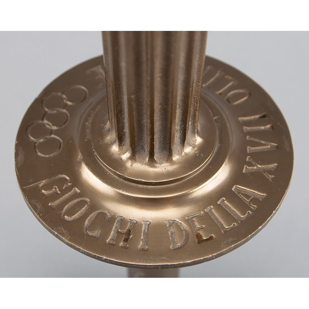Official 1960 Rome Summer Olympics torch, constructed of bronzed aluminum, measuring 15.5″ in length and 3.75″ at its widest point, manufactured by the Curtisa firm of Bologna. The torch’s designer, Amedeo Maiuri, was a renowned Italian archaeologist famous for his studies of the Roman site of Pompeii. Inspired by the designs and patterns of the host city’s ancient ruins and monuments, the torch is grooved with slender conical fluting along its candlestick frame, features consistent with the classical touch of the 1960 Games. The torch platform bears the engraving, “Giochi della XVII Olympiade,†and maker’s marks, “M. F.—Curtisa—Bologna, 2052,†can be found inscribed on the bottom of the handle. The handle and body exhibit scattered wear, dents, and scratches, with a small instance of pitting to upper handle seam. The Olympic flame was lit on August 12 in Olympia, Greece, and was carried a total of 1,863 km—excluding the flame’s voyage from Athens to Syracuse aboard the training ship Amerigo Vespucci—by over 1,500 torchbearers during its historic fourteen-day relay. The XVII Olympiad earns the distinction of being the first Summer Olympics to be telecast in North America.
