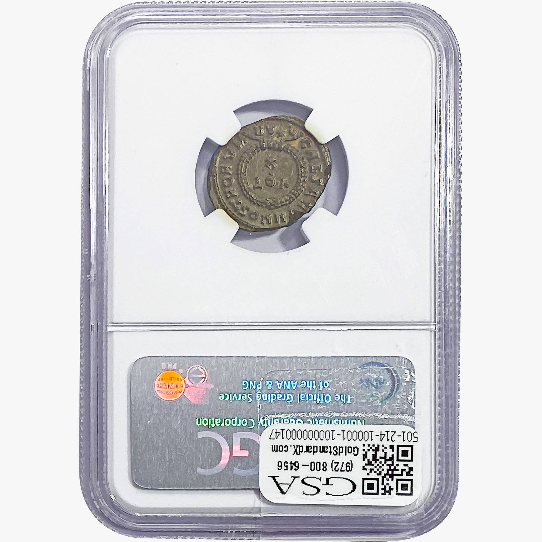 e. Coins sold referencing a third-party grading service are sold “AS IS” without any express or implied warranty, except for a guarantee by GSA that they are genuine. Removal or alteration of the holder, voids all of Bidder’s claims concerning that Product. Certain warranties may be available from the grading services and Bidders are referred to them for further details: Numismatic Guaranty Corporation (NGC), PO Box 4776, Sarasota, FL 34230, www.ngccoin.com/services/writtenguarantee.asp; Professional Coin Grading Services (PCGS), PO Box 9458, Newport Beach, CA 92658, www.pcgs.com/guarantee.html; ANACS, 6555 S. Kenton St., Ste. 303, Englewood, CO 80111; and Independent Coin Grading Co. (ICG), 7901 East Bellview, Ave., Suite 50, Englewood, CO 80111.