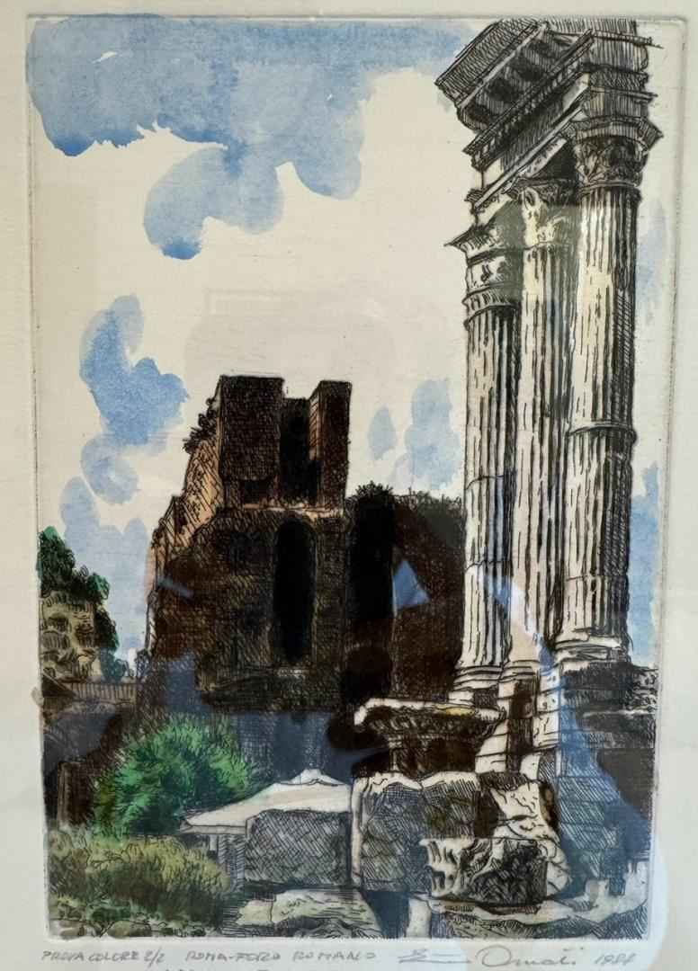 A Unique hand-painted acrylic over limited edition etching by renown Milan artist Ernesto Ornati (1988), 8x4.5" on 20x14" paper, framed to 23x18.5" .