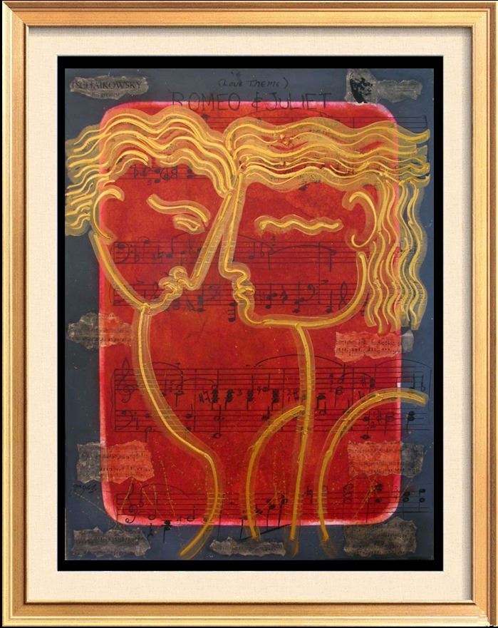 Gaylord Soli | Title Of Art: Romeo & Juliet | Medium: Hand Signed By The Artist Original Acrylic Painting On Canvas | Edition Size: Original | Unframed Size: 48x36 Inches | Offered Unframed or 48x36 Inches Stretched Ready to Hang for additional cost | Value: $ 5000 | Gaylord Soli Was Born In 1939 On A Farm In North Dakota, Shortly After His Parents Emigrated From Oslo, Norway. At The Age Of Three Gaylord And His Family Relocated To Los Angeles, California. While He Has Made Southern California His Home Ever Since, And Currently Works Daily In His Studio In Orange County, His Love Of Open Spaces Never Has Left Him. Much Of Gaylord's Earlier Years Were Spent On Adventures Around The Globe. These Quests Encompassed Camera Safaris To The Kalahari Desert Of Africa, Anthropological Research On The Native Tribes Of The Amazon River, Studies Of Mayan Ruins Of Chitchen Itza In The Yukatan Peninsula, And The Ancient World Of Alexander The Great, From Syria To Mongolia. All Of These Places And Experiences Have Had A Causal Effect Leading To The Exotic Nuances, Romantic Spirit, And Sometimes A Primeval Quintessence Found In Gaylord's Paintings. Gaylord Himself Is Quoted As Recognizing The Profound Influence These Early Experiences Have On His Art: I Have Been Fortunate To Have Traveled The World Extensively. This Has Allowed Me To Explore And Experience Primitive Cultures. I Think My Art Reflects These Experiences. With His Extraordinary Talent, Gaylord Produces Work Of Enormous Impact And Unusual Sensuousness; That Is Filled With Primal Mystery. Gaylord Is A Self-Taught Artist, With Diverse Life Experiences. He Started His Own Company Designing Sports Attire, Has Pinstriped Antique Cars And Designed Fashions For Blackwell And Other Top Designers. Ultimately, He Evolved To Work In The Field Of Serigraphy, Founding Clearwater Publishing In The Early Eighties. In That Capacity, He Gained A Reputation For Producing High Quality Prints For Many Known Fine Artists Including Richard Diebenkorn, Mel Ramos, And Peter Max. Gaylord's Artwork Is Imbued With A Feeling Of Freedom And Spontaneity In Both Image And Technique. Thematically, An Idea Is Allowed A Metamorphosis, To Expand And Grow As The Work Is Executed. Lines, Figures, Textures And Colors Evolve As The Work Progresses Until The Final Stroke Makes The Statement Of Completion.