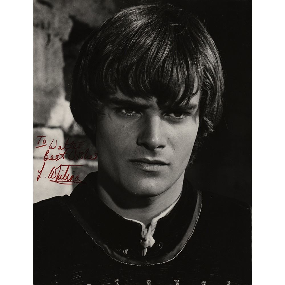 Glossy 7.75 x 10 photo of Whiting as Romeo in Franco Zeffirelli's classic 1968 screen adaptation of Shakespeare's Romeo and Juliet, signed and inscribed in brown felt tip, "To Walter, Best Wishes, L. Whiting." In fine condition, with slightly trimmed edges.