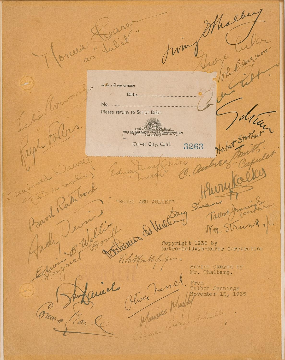 Vintage script cover from the 1936 film Romeo and Juliet, 8.5 x 11, annotated in type at the bottom, “Script Okayed by Mr. Thalberg. From Talbot Jennings, November 13, 1935.” Signed on the front in ink by 27 cast and crew members including: Norma Shearer, Basil Rathbone, Leslie Howard, Irving Thalberg, George Cukor, John Barrymore, Reginald Denny, Andy Devine, Conway Tearle, Edna May Oliver, C. Aubrey Smith, Margaret Booth, Edwin B. Willis, Ralph Forbes, and Talbot Jennings. Cover is affixed to a slightly larger off-white board. Two punch holes to left edge, and some mild toning, otherwise fine condition. An amazing assemblage of Hollywood heavyweights.