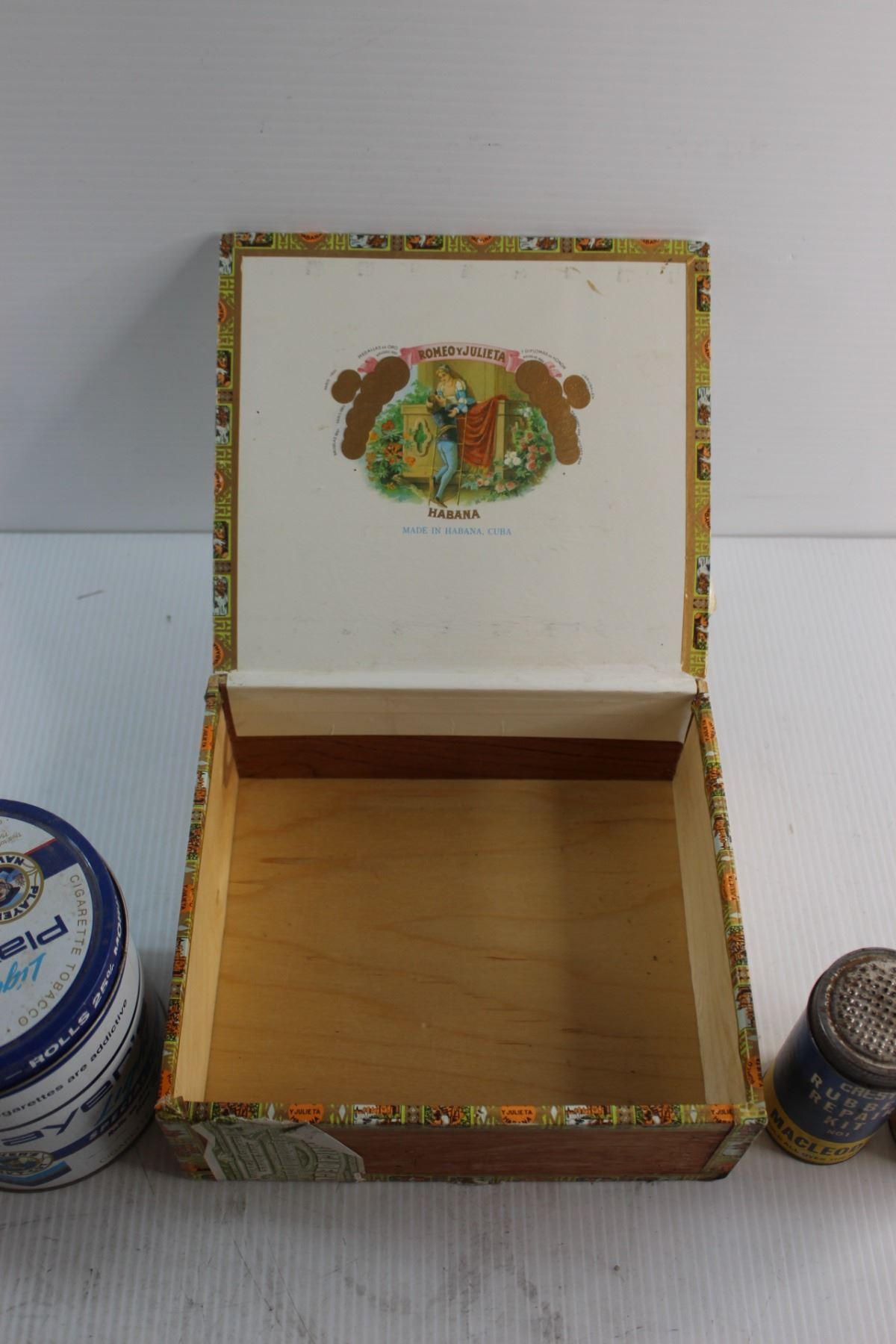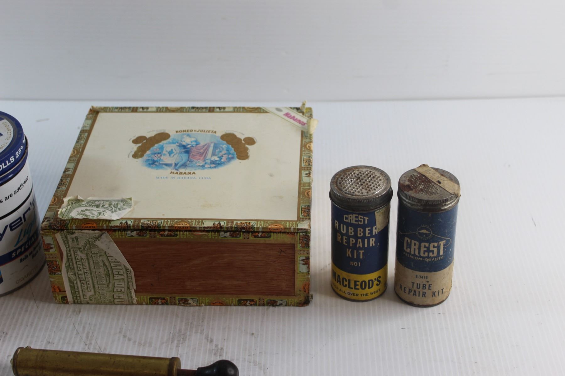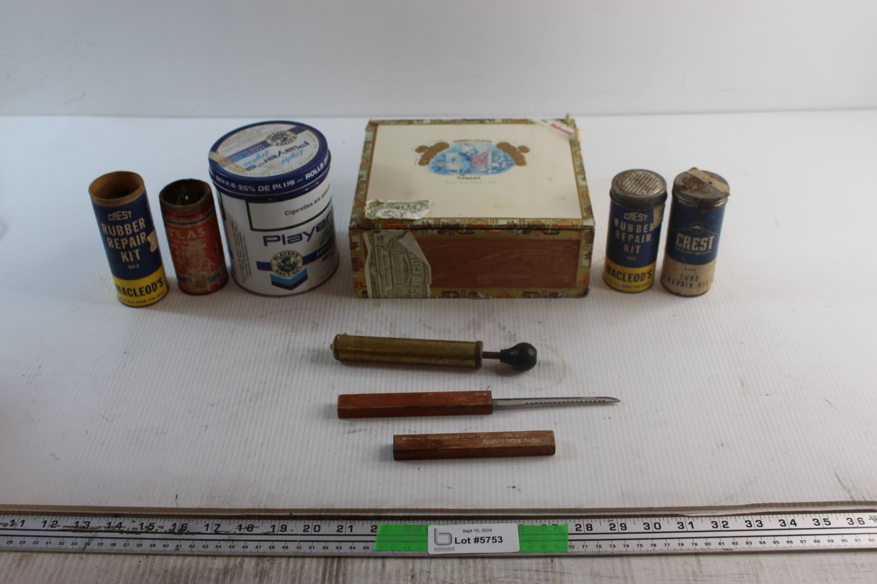Romeo y Julieta Humidor, New Holland Fish Knife and Assorted Tins w/ Contents
