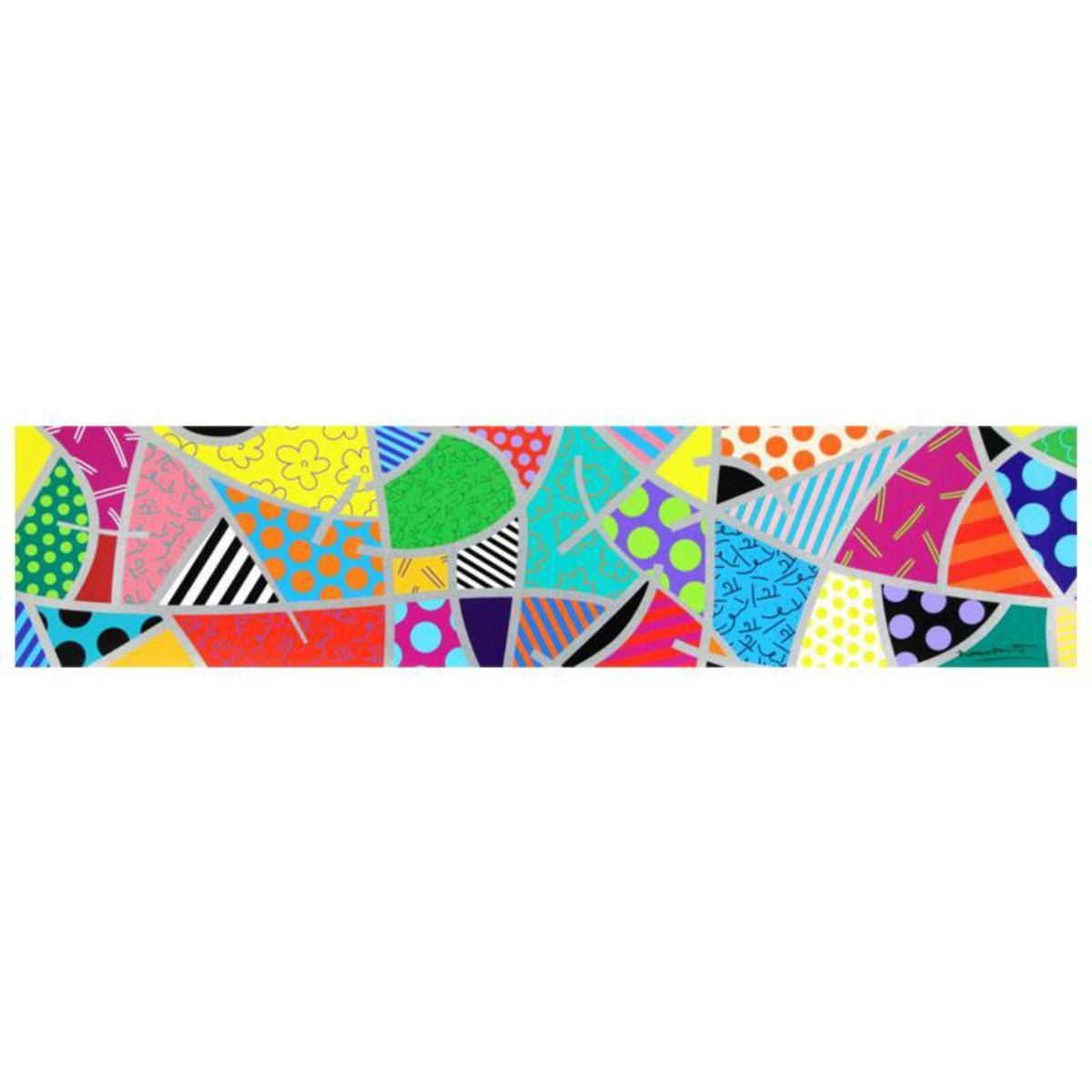 "California" is a limited edition giclee on canvas by Romero Britto. The piece is numbered, hand signed by the artist, and is authenticated en verso with the official Britto stamp. Measures approximately: 16" x 68". Reference #: 239789.