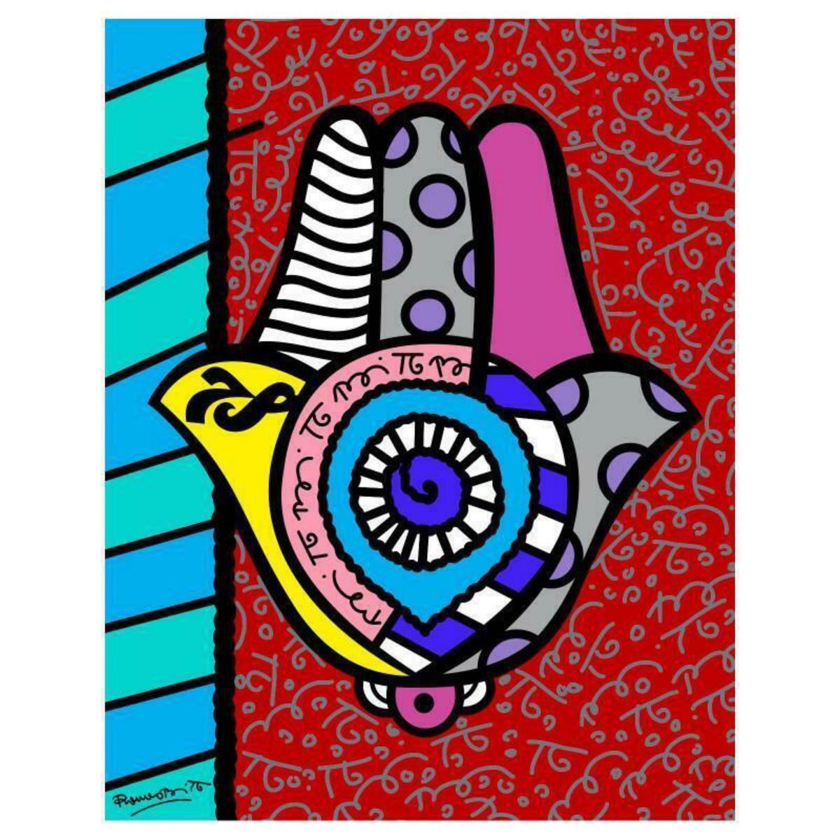 "Hamsa Red Up" is an open edition giclee on canvas by Romero Britto. The piece comes hand signed by the artist and is authenticated en verso with the official Britto stamp. Measures approximately: 14" x 11". Reference #: 239761.