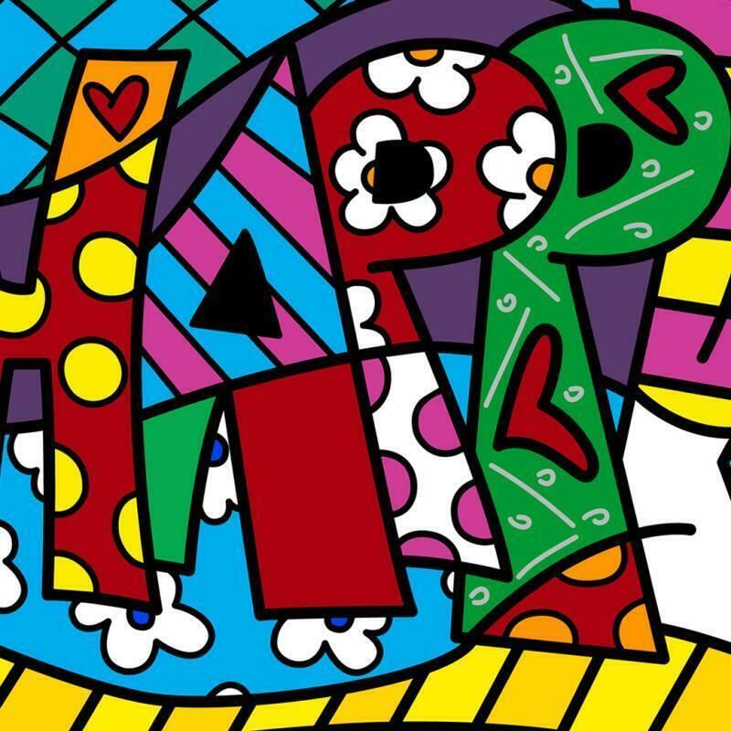 "Happy Mini Word" is an open edition giclee on canvas by Romero Britto. The piece comes hand signed by the artist and is authenticated en verso with the official Britto stamp. Measures approximately: 5" x 7".