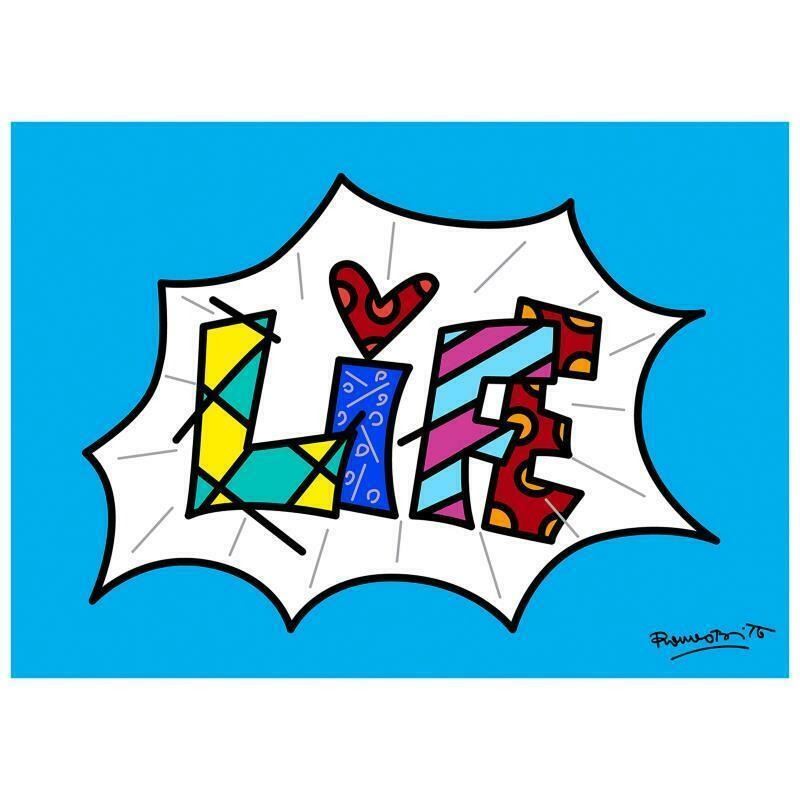 "Life Blue Mini Word" is an open edition giclee on canvas by Romero Britto. The piece comes hand signed by the artist and is authenticated en verso with the official Britto stamp. Measures approximately: 5" x 7". Reference #: 239734.