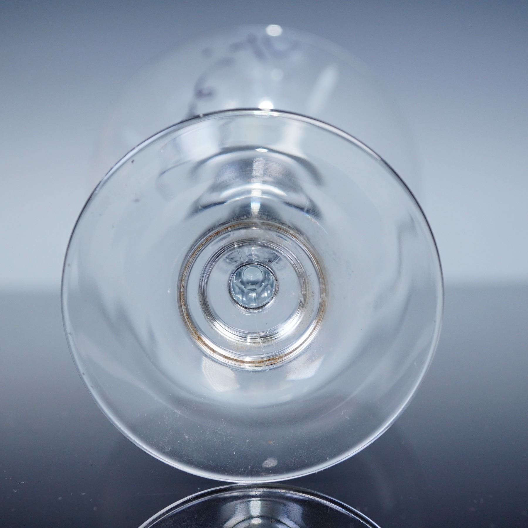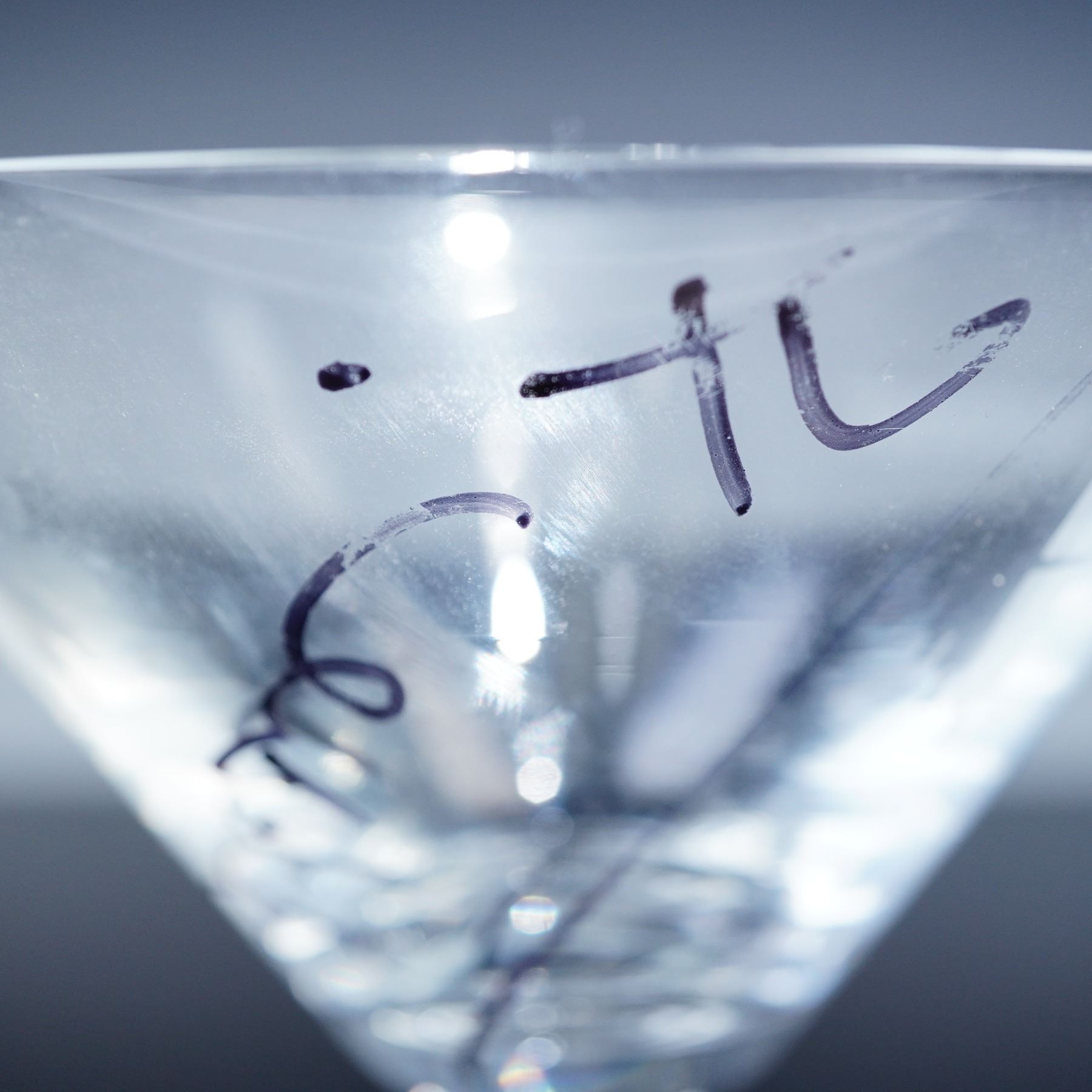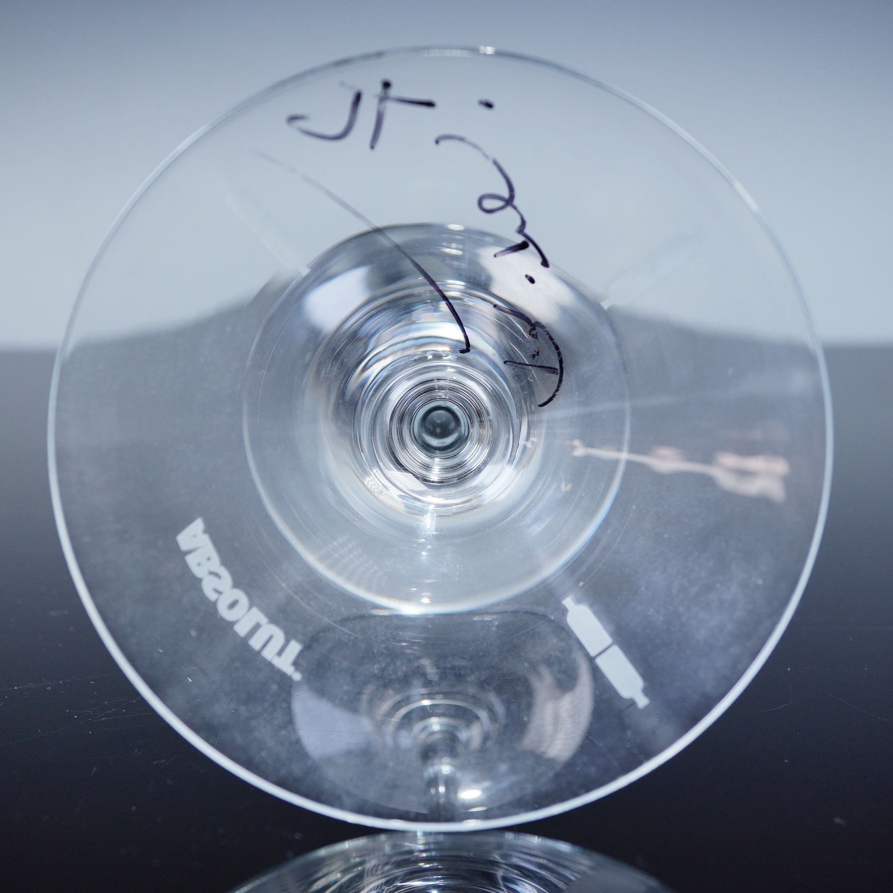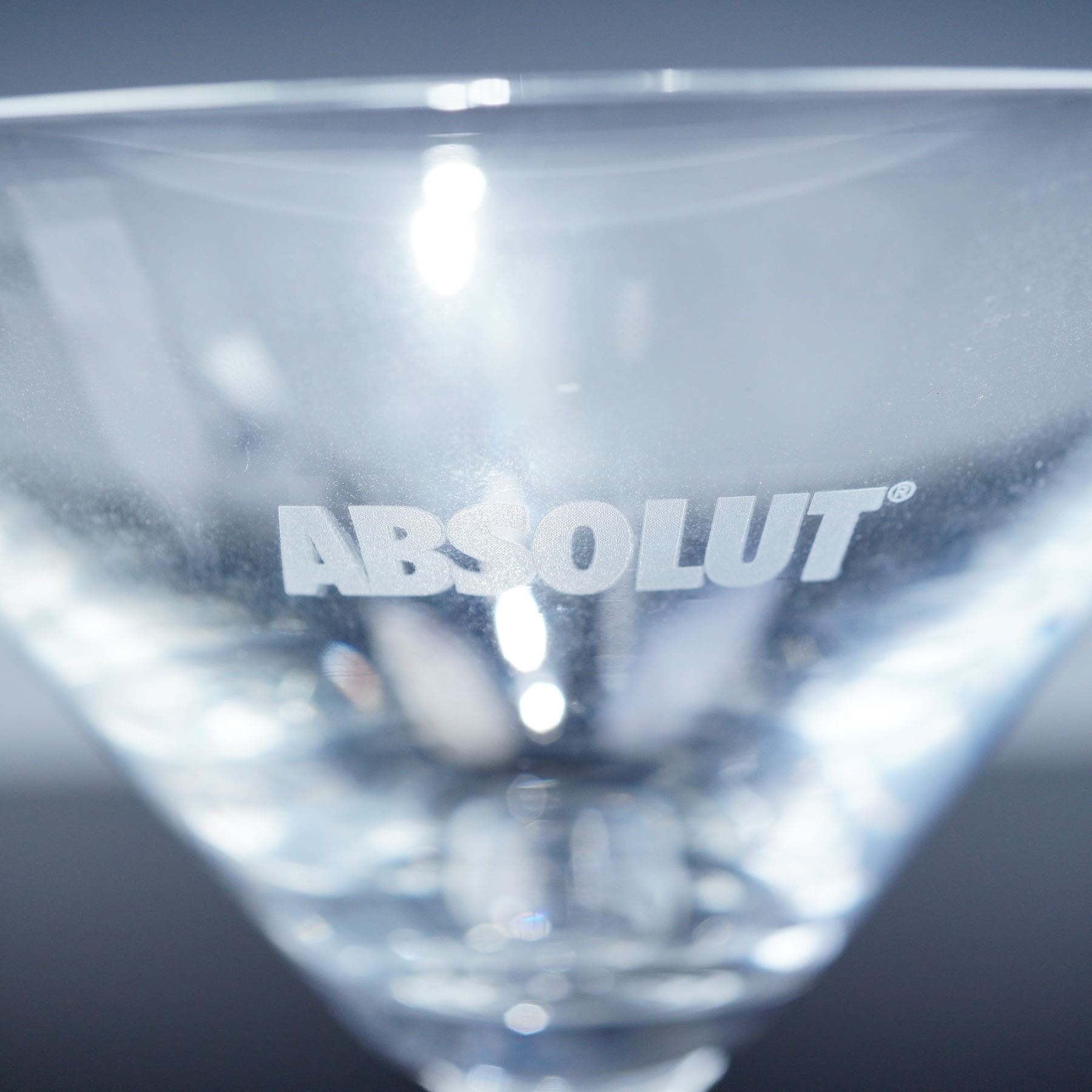 This lot features a clear martini glass produced for Absolut, etched with the Absolut logo on the bowl. The glass has been signed in black marker by artist Romero Britto, free form script wrapping around the surface of the vessel. The stemmed glass maintains its classic martini silhouette, with a broad conical bowl tapering to a slender stem and circular base.