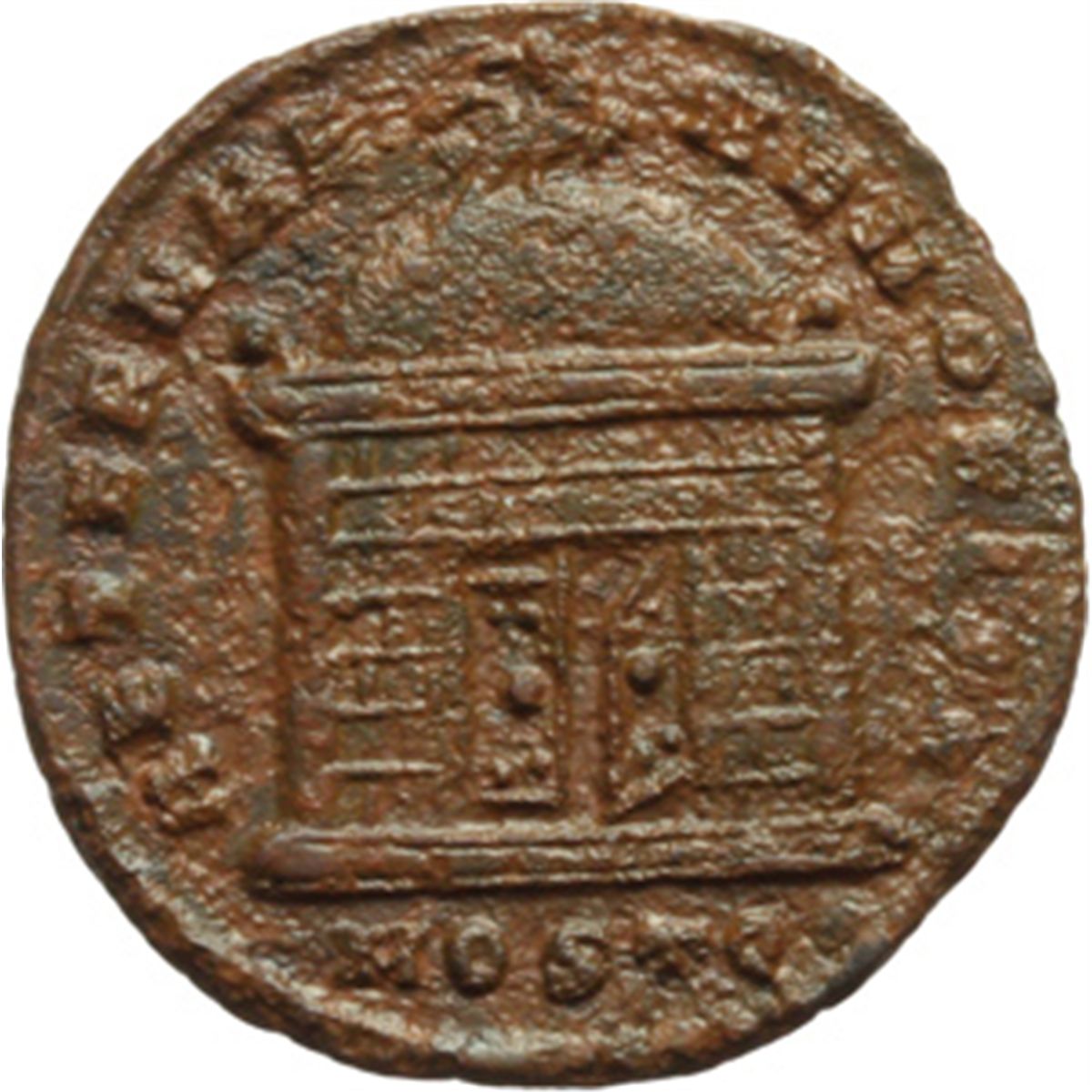 Impero Romano. Romolo (deceduto nel 309 d.C.). Frazione di follis, Ostia. D/ DIVO ROMVLO NV BIS C. Testa nuda a destra. R/ AETERNAE MEMORIAE. Tempio a cupola. Sopra, un'aquila. In esergo: MOSTQ. RIC 59. AE. g. 1.78 mm. 16.00 R. Patina rame rosso. BB/BB+.