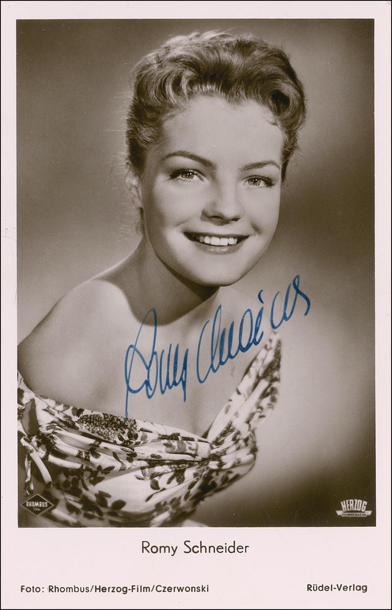 Respected Vienna-born actress (1938–1982) whose death, though officially ruled heart failure, was believed by many to have been a suicide induced by a string of personal tragedies, including the accidental death of her 14-year-old son. Vintage glossy 3.5 x 5.5 postcard photo, signed in fountain pen. In very good condition, with scattered surface postal impressions and surface marks, none affecting the signature.