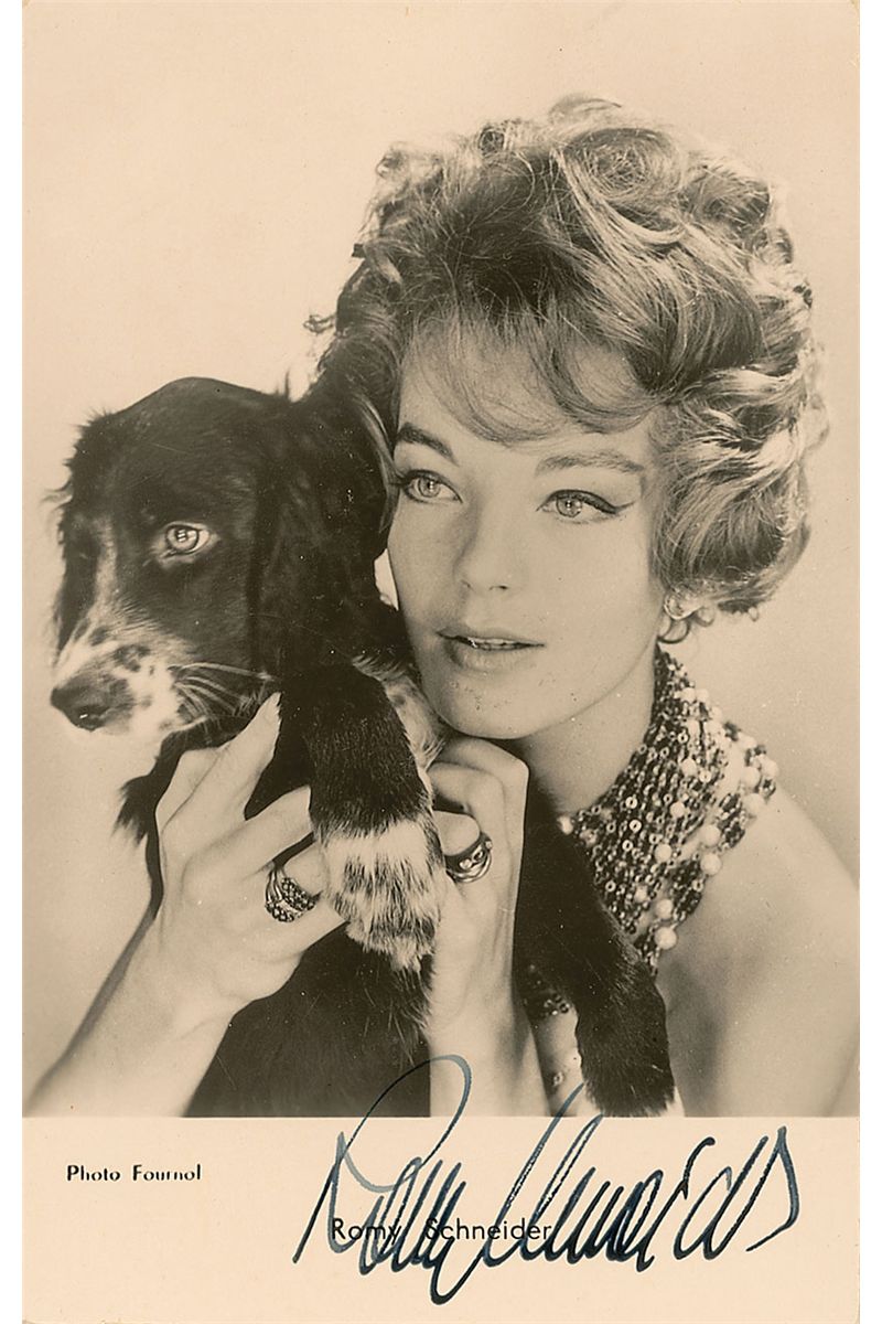 Vintage glossy 3.5 x 5.5 French real photo postcard of Schneider holding a dog, signed in the lower border in fountain pen. In fine condition, with a couple light creases.