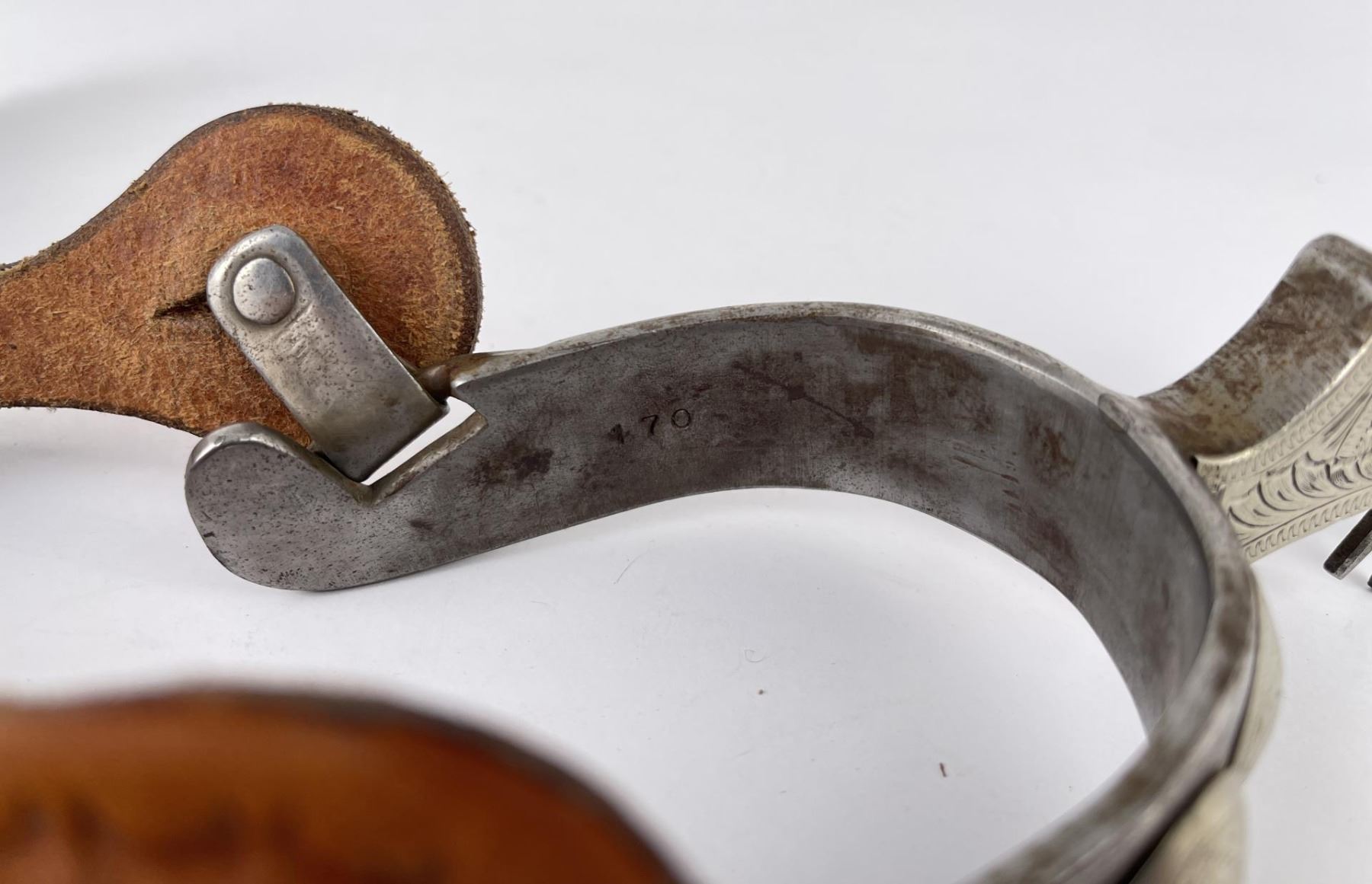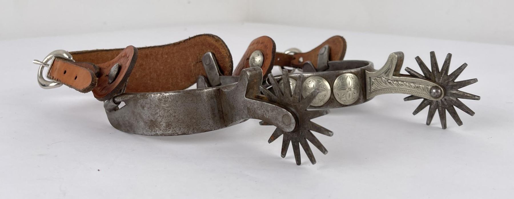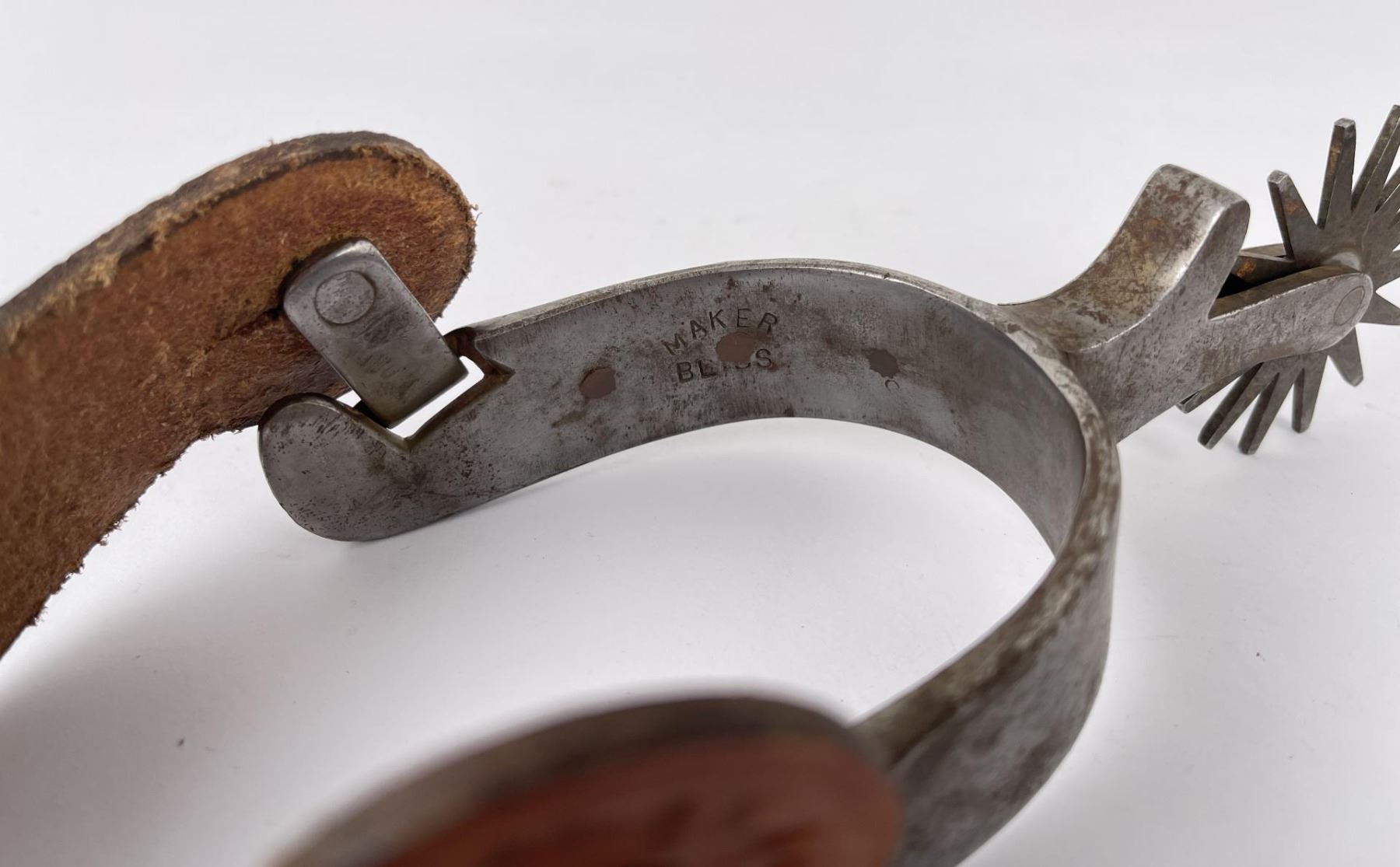 Nice pair of spurs. Marked Ron Bliss. Ron Biss grew up as a working cowboy taking-up spur making after a horse accident curtailed his riding in 1999. He is largely self-taught drawing inspiration from the more creative, early California Vaquero spur makers like GS Garcia and Jesus Tapia.