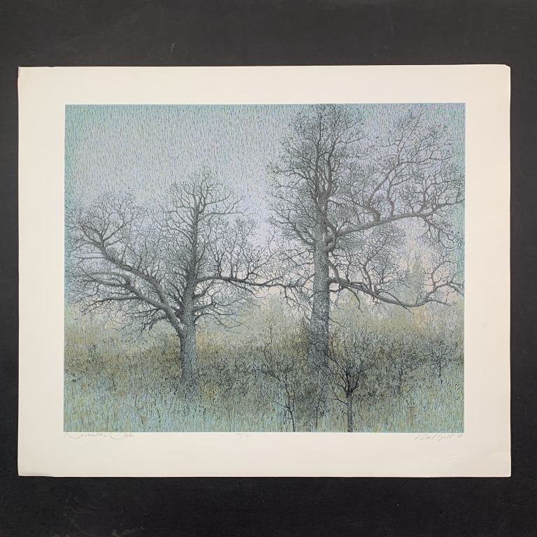 Ron Bolt's "November Oaks" limited edition print, signed and dated lower right, numbered 137/175 lower middle, and titled lower left. This piece is of two large bare trees. This piece is in near excellent condition with crease upper left corner.
