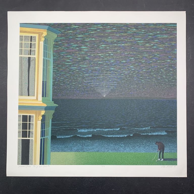 Ron Bolt's "Summer Games The St. Ives Suite #2" limited edition print, signed and dated lower right, titled lower left, and numbered 123/175 lower middle. This piece is of a lone golfer, at the water's edge, about to tee off into the water. This piece is in near excellent condition with miniscule to extremely minor creases upper left corner and upper right corner.