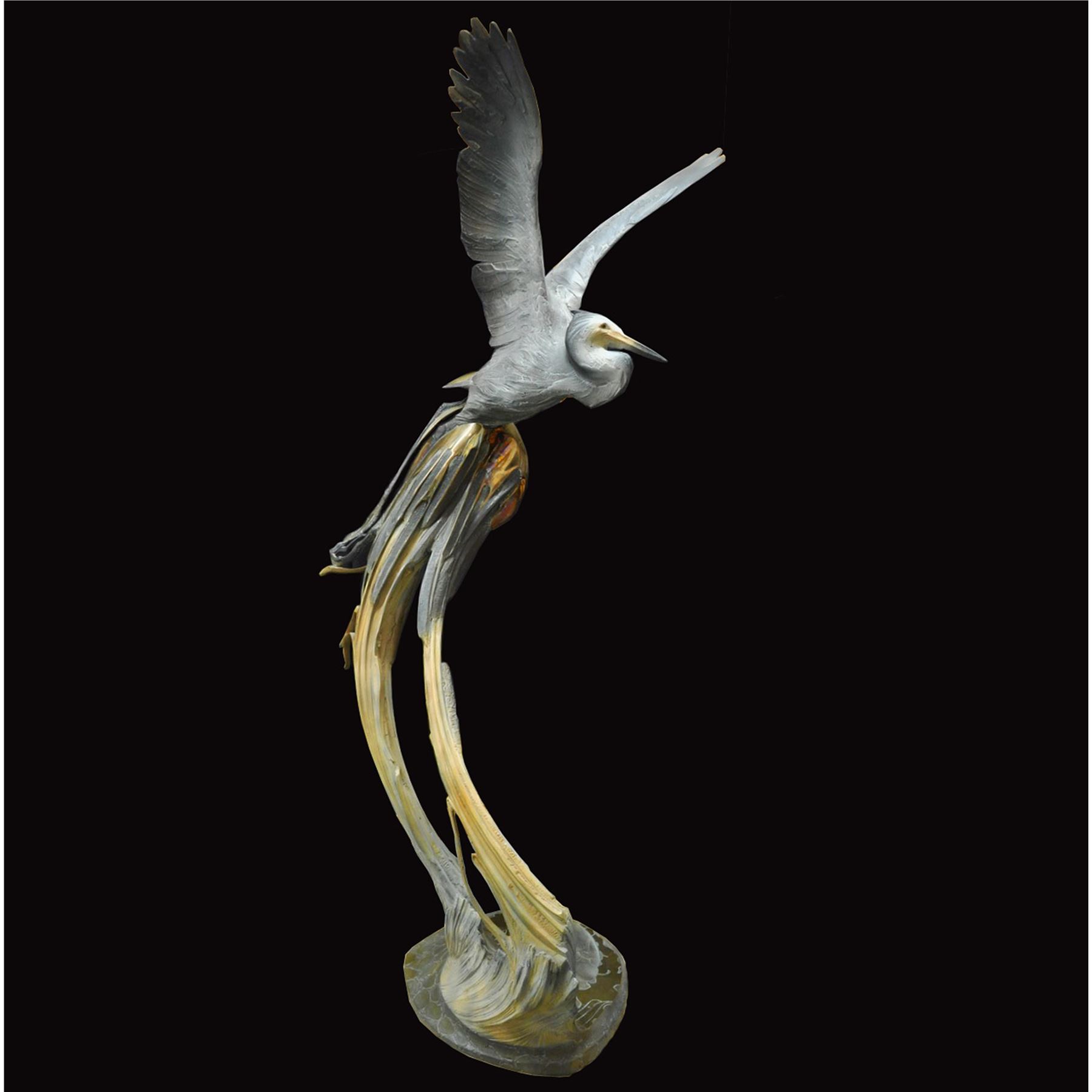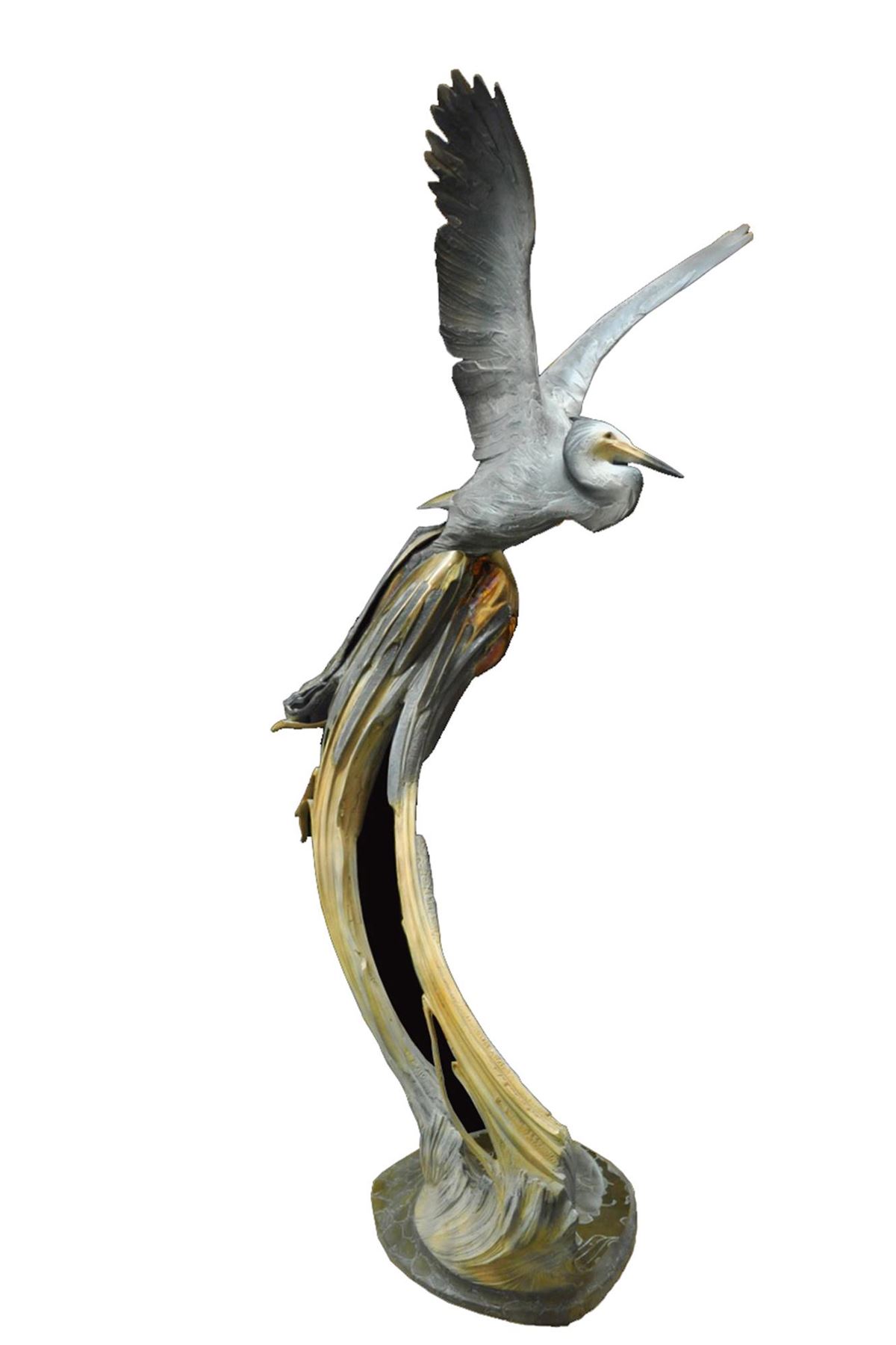 Ron Chapel's "Cathedral Springs" limited edition 6/10 bronze sculpture. This is a magnificent sculpture of a tall heron. With its incredible size and such exquisite detail, this truly is a masterpiece. Sculptures of this stature do not regularly become available in the secondary market, so collectors and investors alike jump at the chance to own them. This sculpture's retail price is $35,000 USD. 82" tall x 34" long x 22" wide. Ron Chapel. Featured.82" tall x 34" long x 22" wide