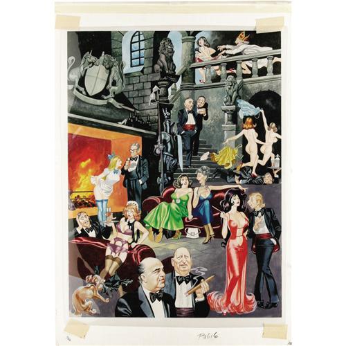 <B>Ron Embleton - Oh, Wicked Wanda Splash Page Original Art (Penthouse, 1970s).</B></I> This erotic splash page from <B>Penthouse</B></I> magazine's response to <B>Playboy</B></I>'s "Little Annie Fanny" is label as part 36, page 6. The lettering is on a vellum overlay, while the near-flawless artwork is protected by a clear acetate sheet. The art has an image area of 14.75" x 20" and aside from some minor tape stains and corner bumps, is in Excellent condition.