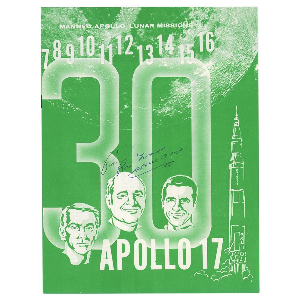 Uncommon official NASA Apollo 17 mission plan booklet, eight pages, 8 x 10.5, signed on the front cover in blue ballpoint, "Ron Evans, Apollo 17 CMP." The booklet offers brief summaries of previous Apollo missions and detailed information about the upcoming Apollo 17 flight, including crew biographies, timeline of events, and flight profile. In fine condition, with the start of another Evans signature, using a faulty black pen, above.