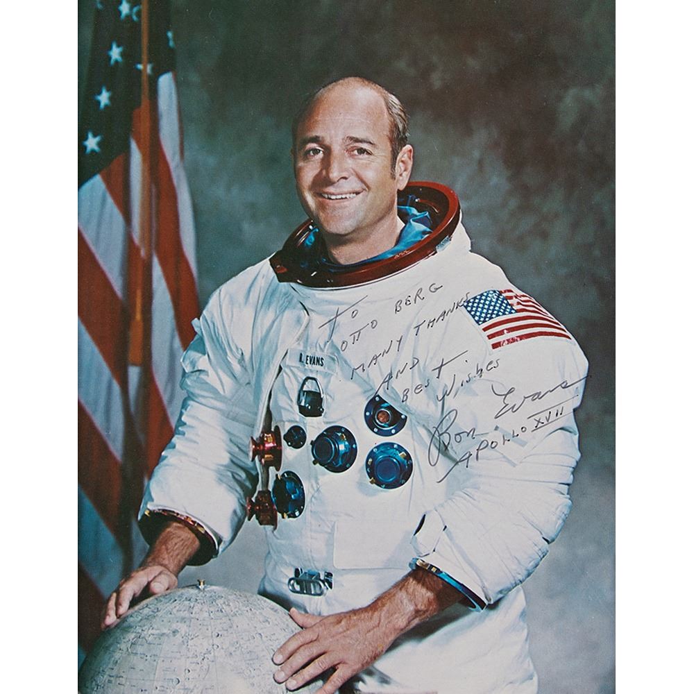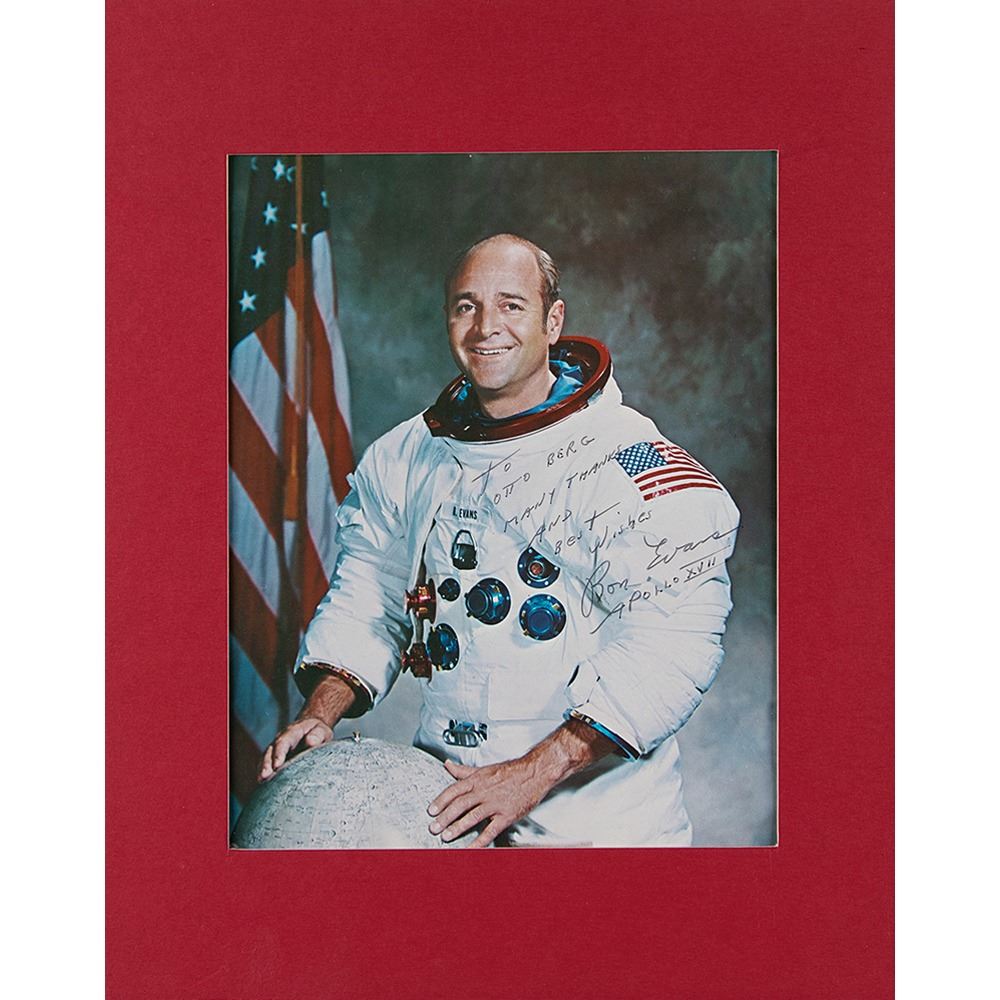 Official color 7.5 x 9.5 NASA lithograph of Evans posing in his white space suit with a lunar globe, signed and inscribed in black felt tip, "To Otto Berg, Many thanks and best wishes, Ron Evans, Apollo XVII.” Matted to an overall size of 10.75 x 13.75. In fine condition, with the signature and inscription slightly faded.