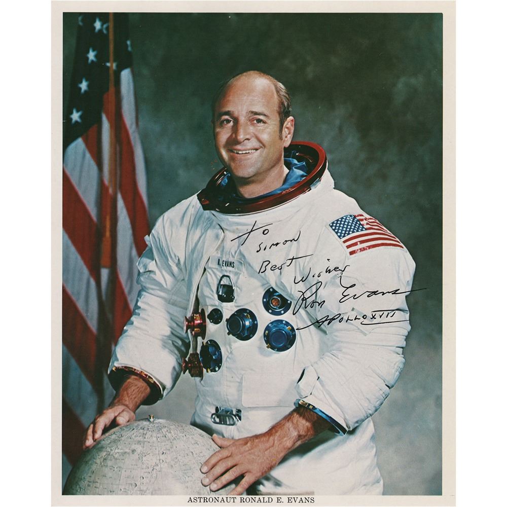 Official color 8 x 10 NASA lithograph of Evans posing in his white space suit with a lunar globe, signed and inscribed in black ink, "To Simon, Best Wishes, Ron Evans, Apollo XCII." In fine condition.