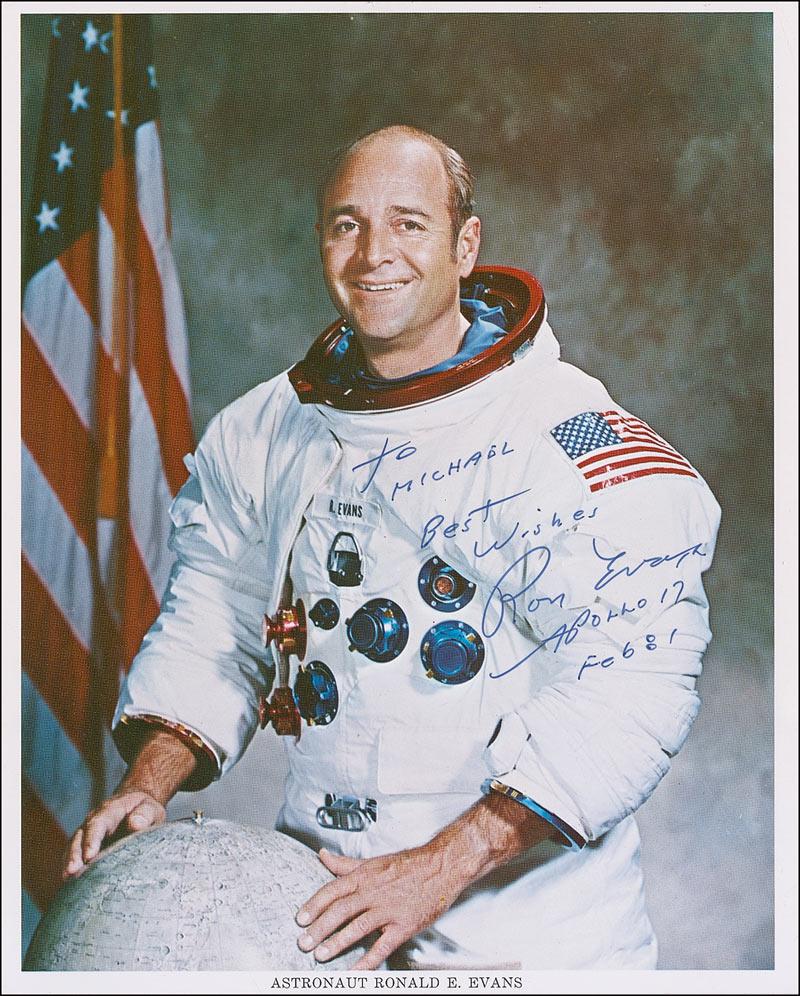 Color 8 x 10 NASA photo of Evans in his white spacesuit, signed and inscribed in blue felt tip “To Michael, Best wishes, Ron Evans, Apollo 17, Feb 81.” In very fine condition.