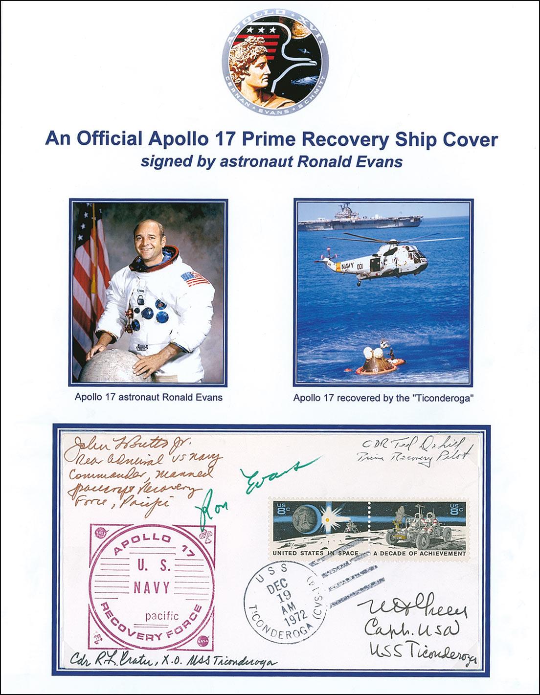 Apollo 17 prime recovery ship commemorative cover, signed in green felt tip by Evans, and also signed by four members of the recovery crew. Removably presented on a color 8.5 x 11 informational sheet. In fine condition.