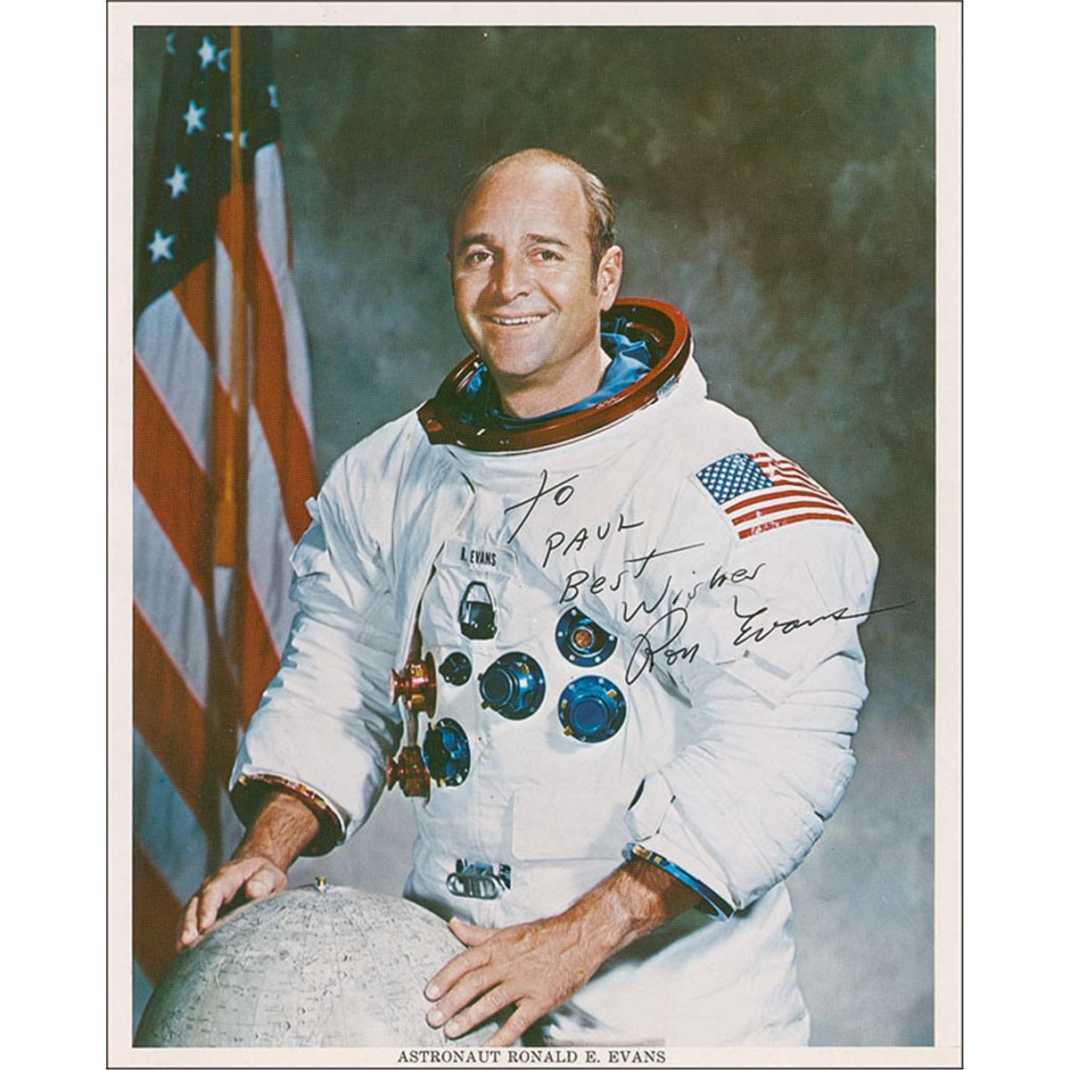 Color 8 x 10 NASA photo, signed and inscribed in black felt tip, “To Paul, Best Wishes, Ron Evans.” In fine condition, with light surface marks and trivial corner creasing.