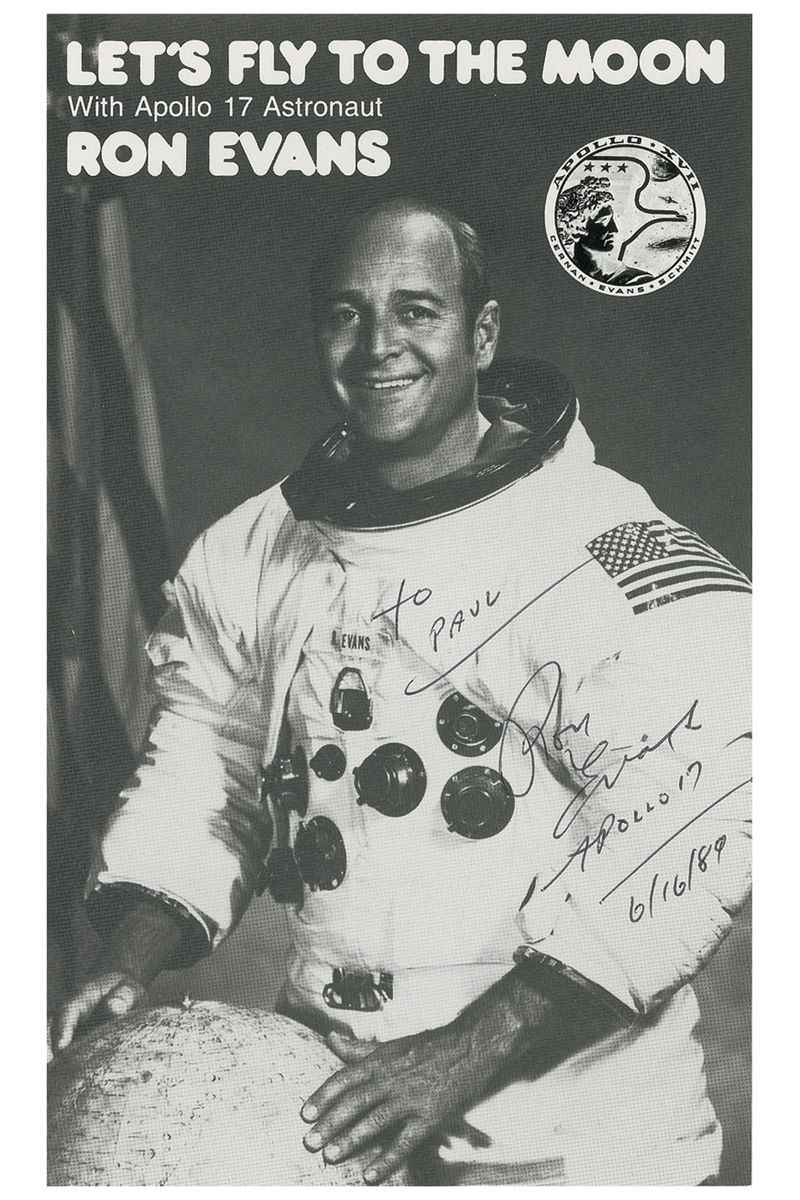 Order card for “Let’s Fly to the Moon with Apollo 17 Astronaut Ron Evans,” 5 x 8.25, with an image of Evans on one side and an order form printed on reverse, signed and inscribed on the image in black ballpoint, “To Paul, Ron Evans, Apollo 17, 6/16/89.” Evans also crosses out a price on the reverse, “30.00 Ron.” In fine condition, with a couple of light creases, one through a small portion of signature.